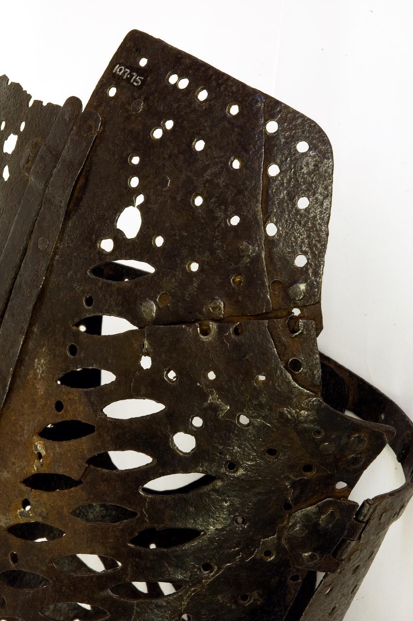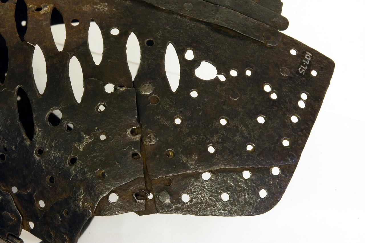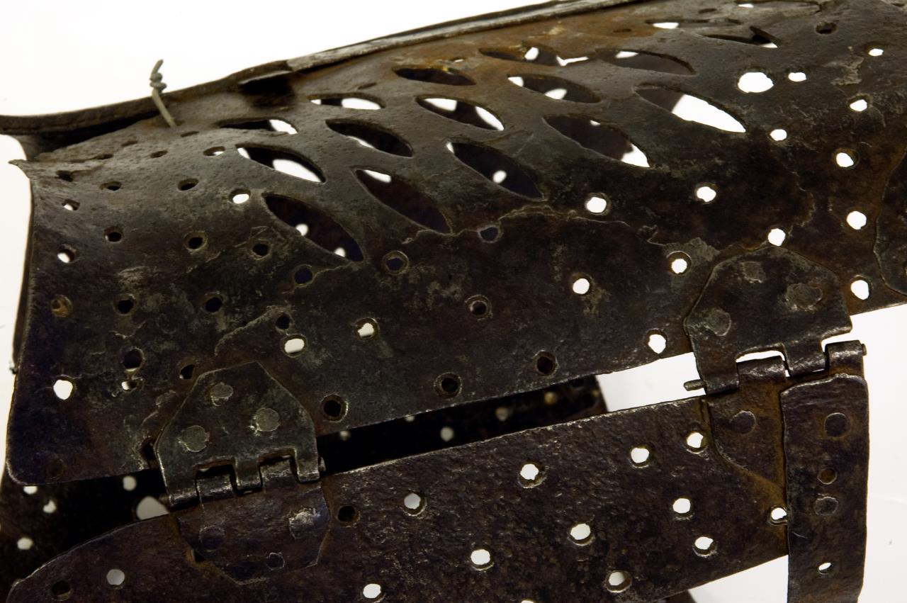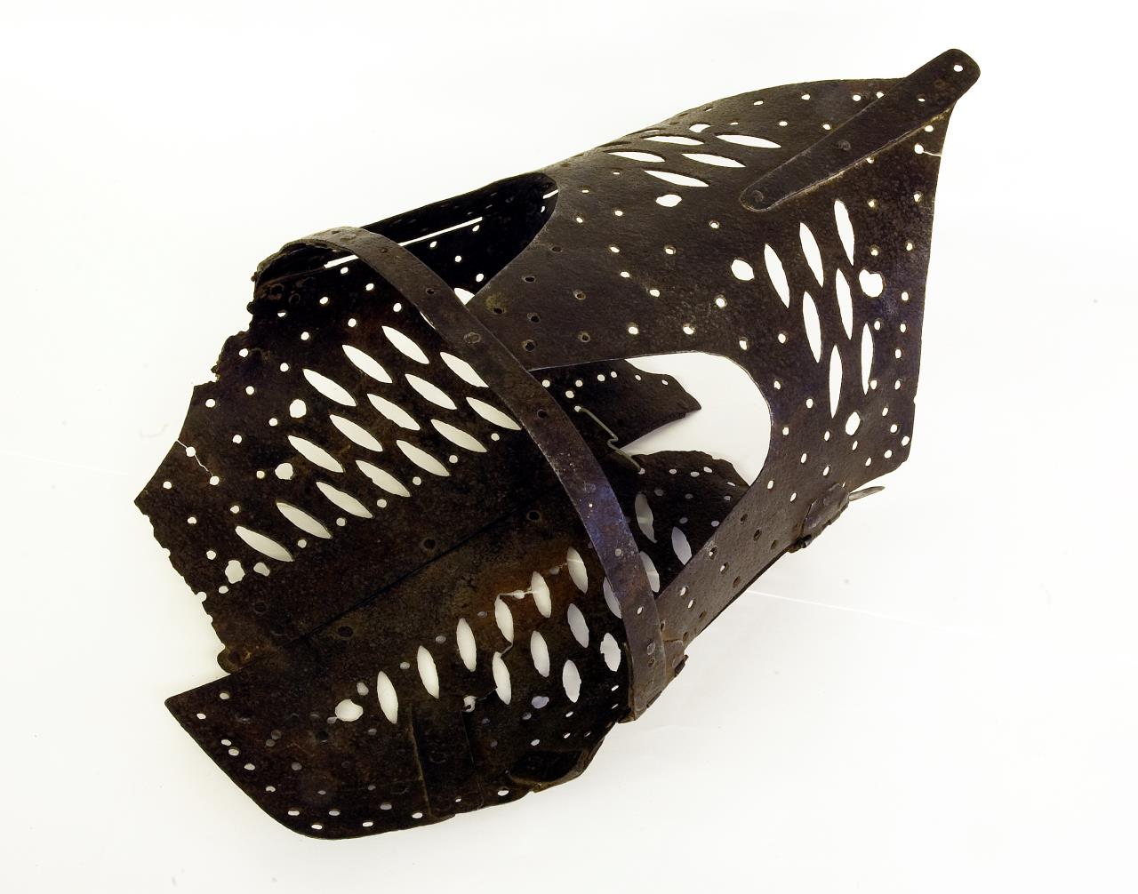 Corset of iron with back clasp opening and hinges at either side. The whole is perforated. The front tapers away into a point. A narrow band forms the top front below which are two large holes.