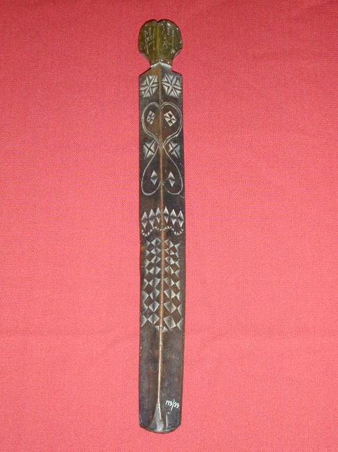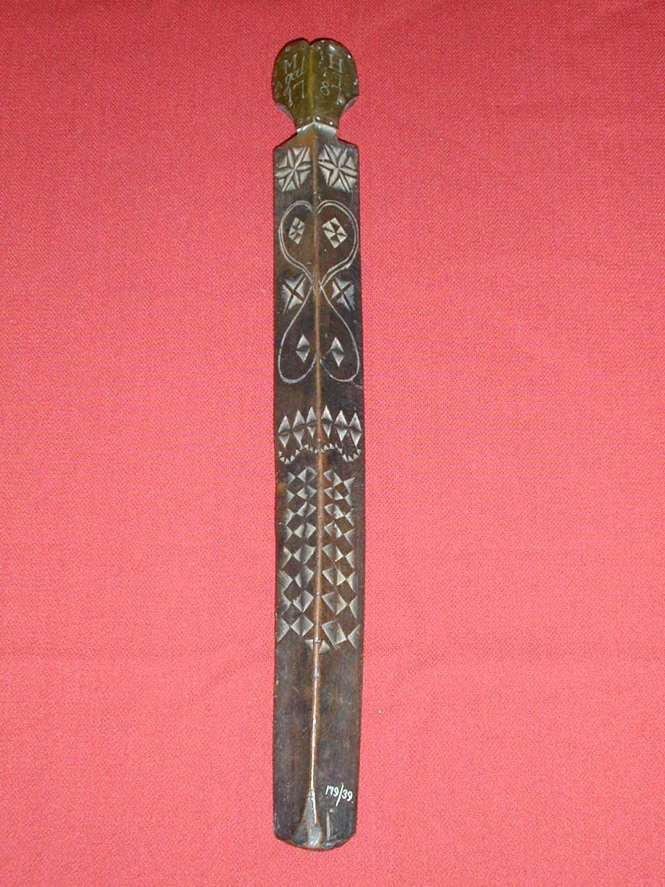 - Stay busk made of wood. The front is carved with diamond and star shapes. The top end is carved into a heart shape, the front of which is covered with brass and incised with the "MH Aged 17 1787".