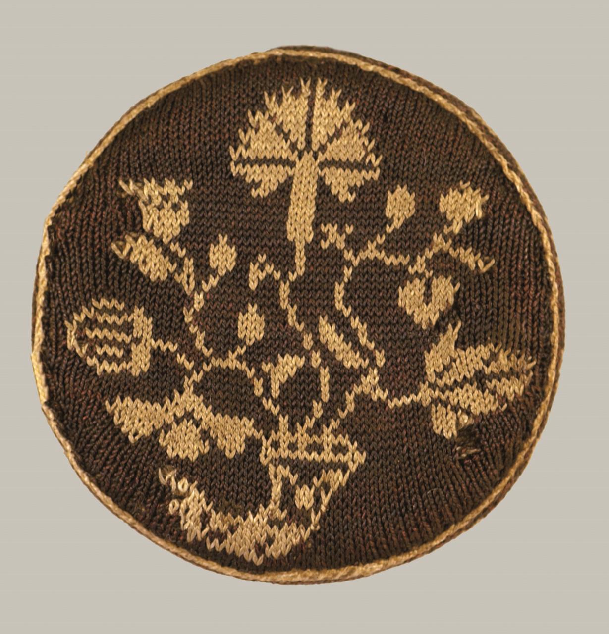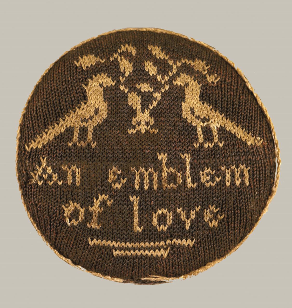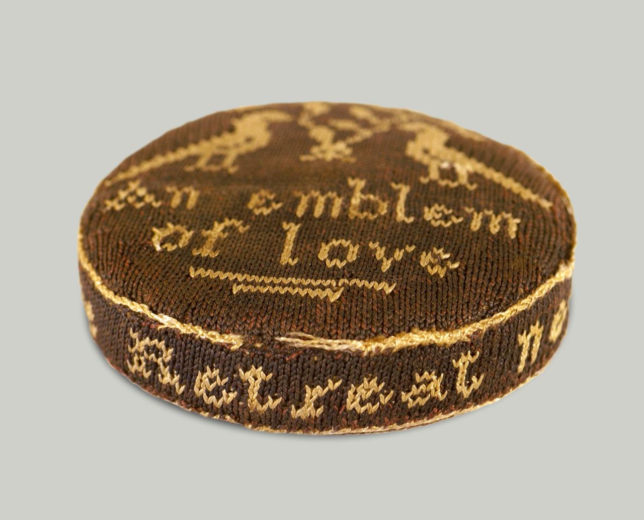 - Disc pincushion, knitted in indigo silk with a cream pattern. Obverse: Two birds and a branch, inscription, "An Emblem of Love." Reverse: Cornucopia with flowering sprays. Side: Inscription, "From the Retreat near York." The edges are finished with white twist.