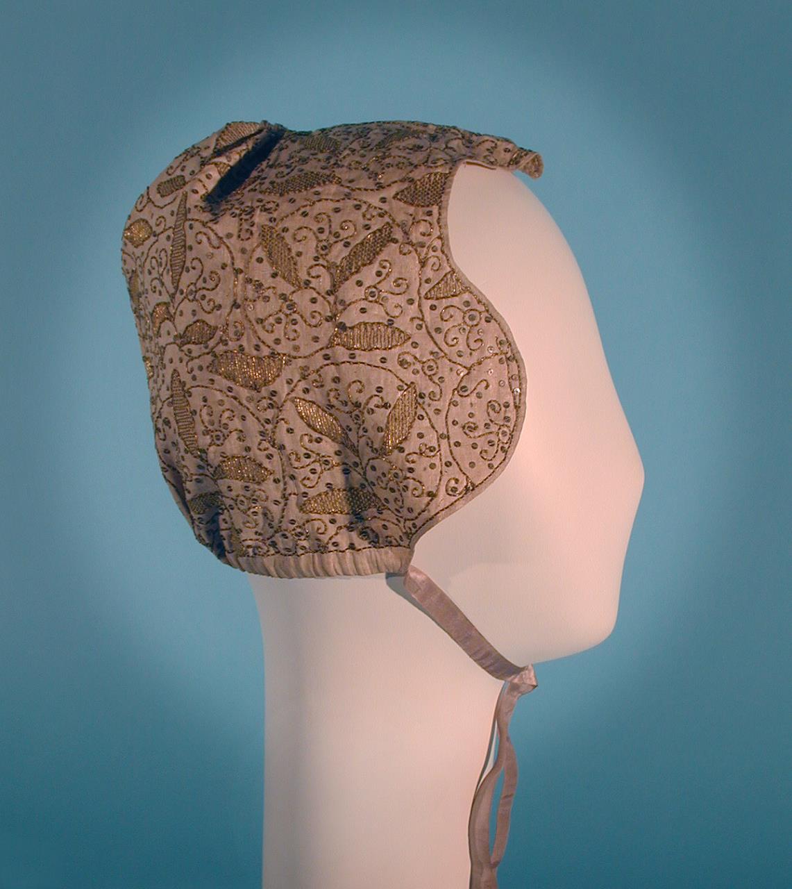- Small cream linen coif with green couched embroidery with small metal sequins and satin ribbon.
