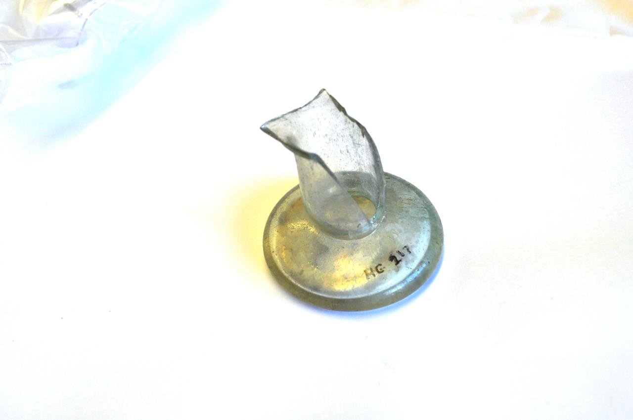 Discoid unguent bottle. Light green; many small bubbles. Rim edge missing; impressed inscription on base - PATRIMONI. Eboracum reports: "Many examples with this same inscription are known, four from Rome, two from Gaul, and one from Cologne; in Britain examples come from Lincoln, Chester, Densworth (Sussesx) and Bath."