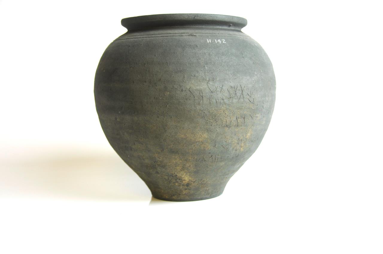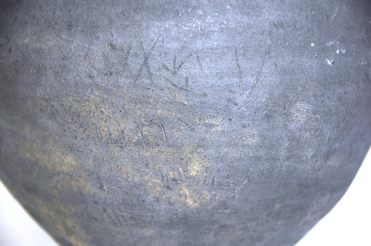- Accompanying label records that the vessel was found containing a cremation, and the inscription refers to its earlier domestic usage.
