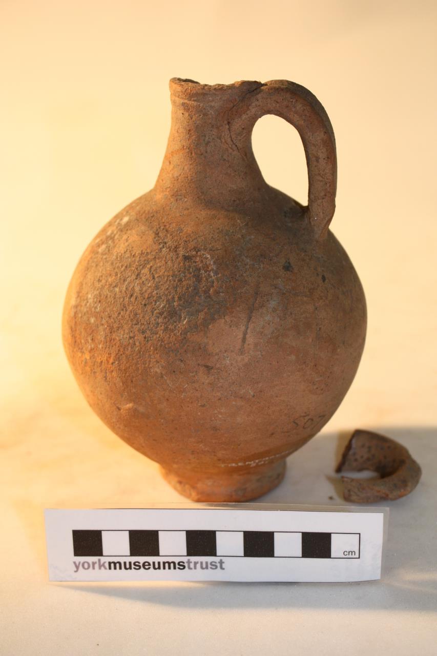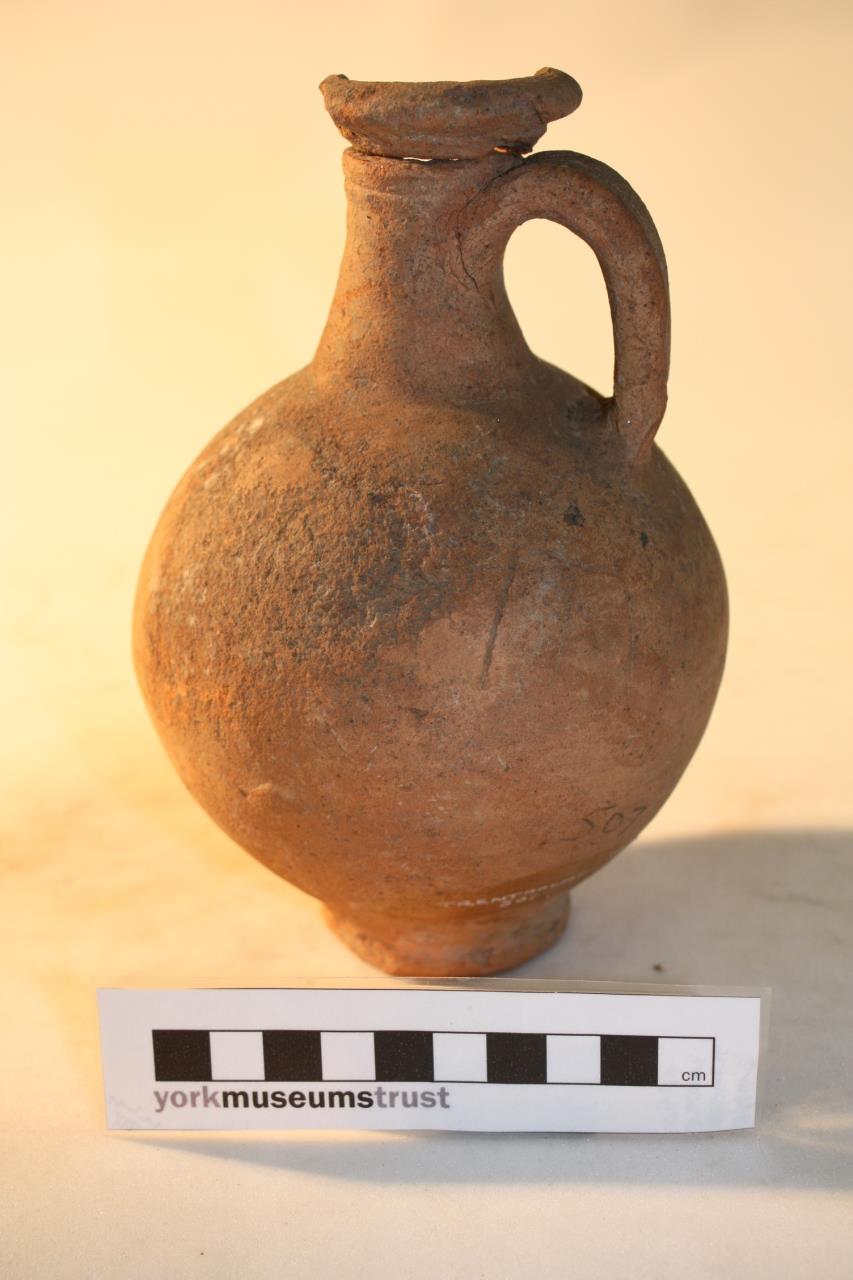 Ring neck flagon with single handle and graffito. Described in Eboracum as "Flagon, ring necked, of mid 2nd century date, in orange self-coloured fabric with a graffito, PIII 'Pondo III', on the shoulder. It was buried above the right elbow of a skeleton."