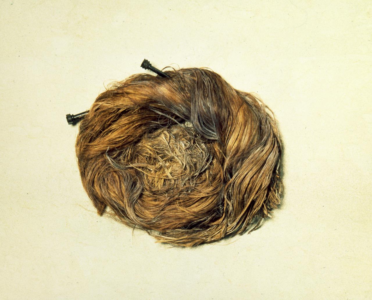 - Hair piece, found in a sarcophagus containined a lead coffin and gypsum. The lead coffin was decorated with a corded pattern. The preservation of the hair is really very unusual - presumably it had been treated with somethign prior to internment that has affected it in this way. The head may have originally laid upon a pillow, preventing initial contact with the gypsum. Two cantharus-headed jet pins remain in situ in the hair.