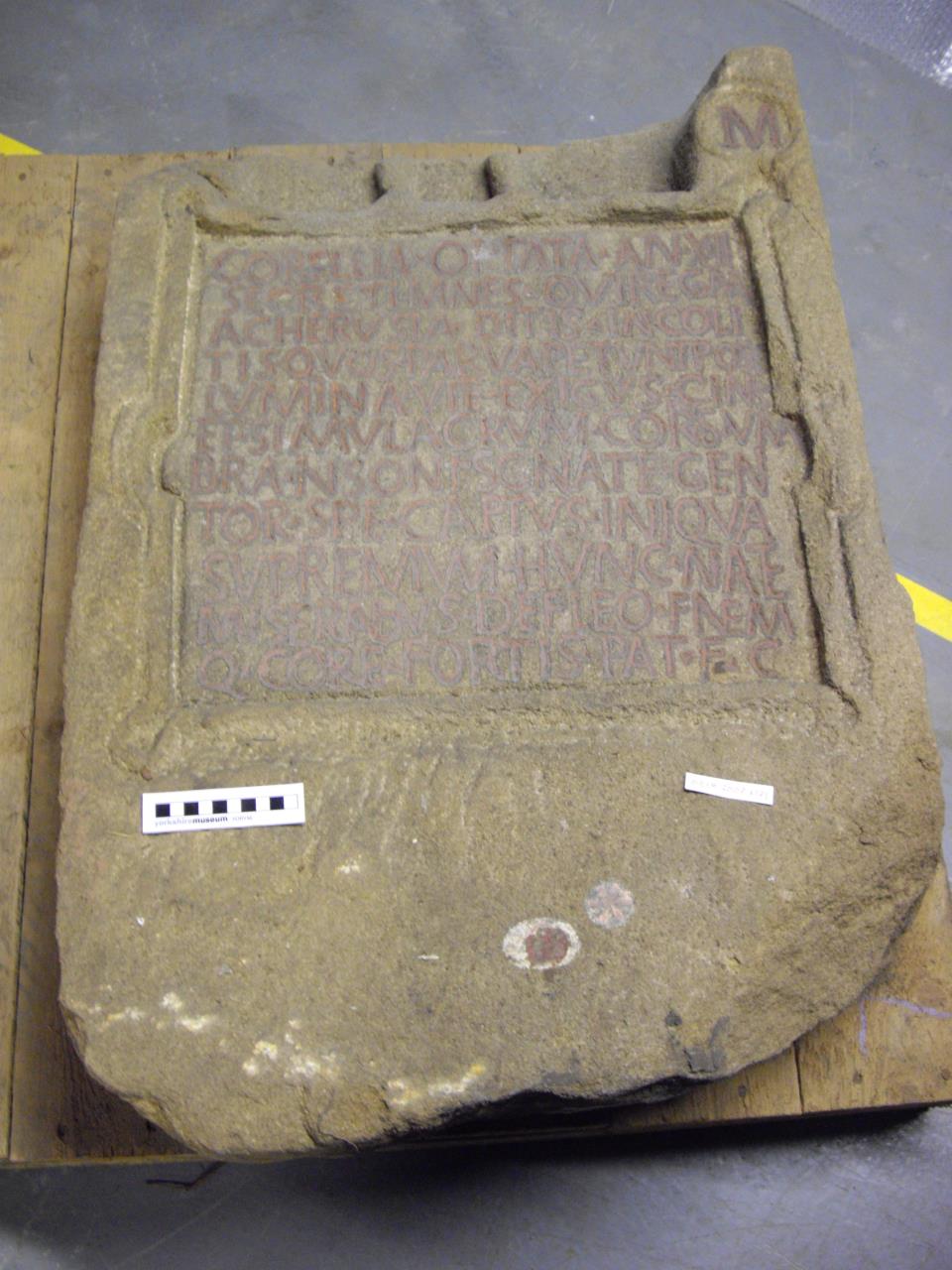 Tombstone commemorating Corellia Optata. Described in Eboracum as "Tombstone of gritstone, 2ft by 3ft by 7ins, with the upper panel, except for the feet carved in relief, broken off. The inscription is in a moulded panel with loops at each corner and decorative curved projections in the middle of each side, while the letters D M lie outside it, flanking the relief in an extra loop above the top corners, only the M now surviving. D(IS)] M(ANIBVS) CORELLIA OPTATA AN(NORVM) XIII SECRETI MANES QVI REGNA ACHERVSIA DITIS INCOLI TIS QVOS PARVA PETVNT POST LUMINA VITE EXIGVIS CINIS ET SIMVLACRVM CORPORIS VM BRA INSONTIS GNATE GENI TOR SPE CAPTVS INIQVA SVPREMVM HVNC NATE MISERANDVS DEFLEO FINEM Q(VINTVS0 CORE(LLIVS) FORTIS PAT(ER) F(ACIVNDVM) C(VRAVIT) 'To the spirits of the departed. Corellia Optata, 13 years old. Ye hidden spirits that dwell in Pluto's Acherusian realms, whom the scanty ash and the shade, the body's image, seek after life's little day, I , the pitiable father of an innocent daughter caught by cheating hope, lament her final end. Quintus Corellius Fortis, the father, thad this made.' "