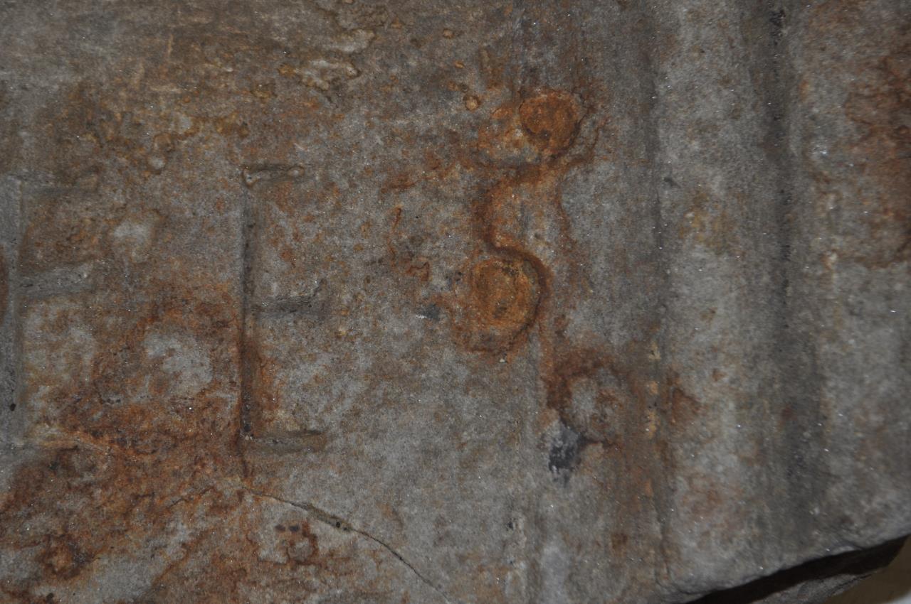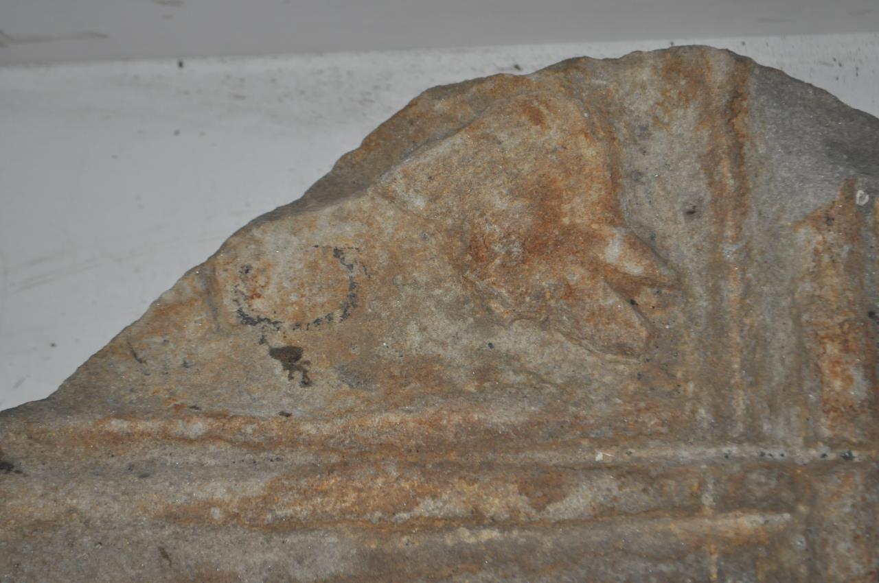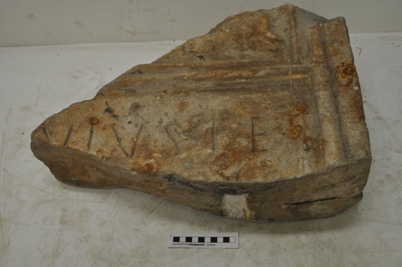 - Described in Eboracum as "Tombstone fragment, of gritstone, 1ft 8 and 1/2 ins by 1ft 3 and 1/2 in by 5 and 1/2 in, with relief above and inscription below, both in panels with simple moulded frames. Of the relief only the end of a scroll or piece of strapwork remains, and part of the M of DM, of the inscription only the end of the first and second lines.... D(IS)] M(ANIVS0/ .....VIVS FE/ ....VS/ ....CIL"