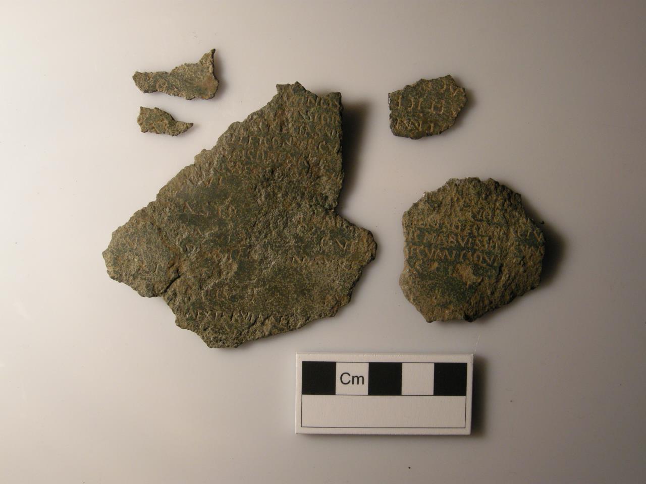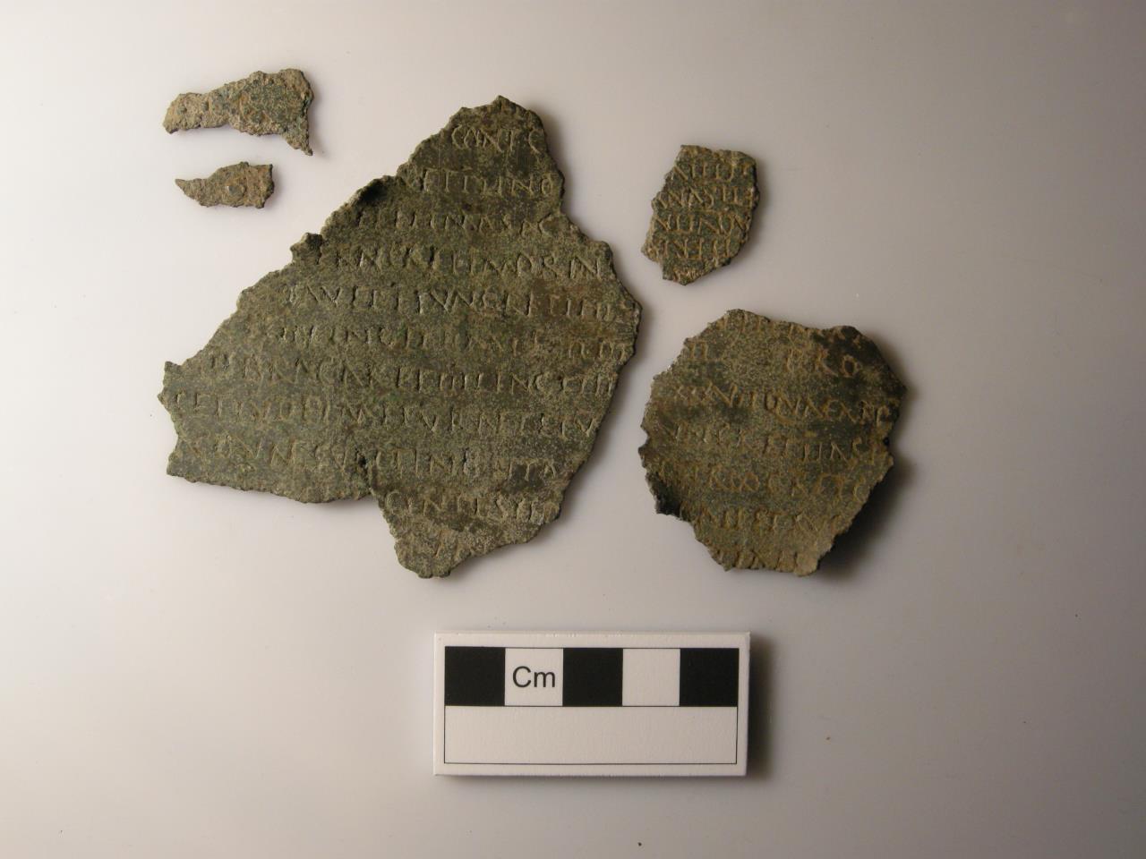 The inscription is visible on both sides of all the fragments. Enough remains of the date and the military units to show that it belong to the same issue as the Briegtio diploma from Hungary now in the British Museum. It was issued to an infantry solider of Cohors V Raetorum but whose name is lost. The soldier’s commanding officer can be named as Sextus Cornelius Dexter of Saldae in Mauretania. (With thanks to Roger Tomlin for aid in the identification)