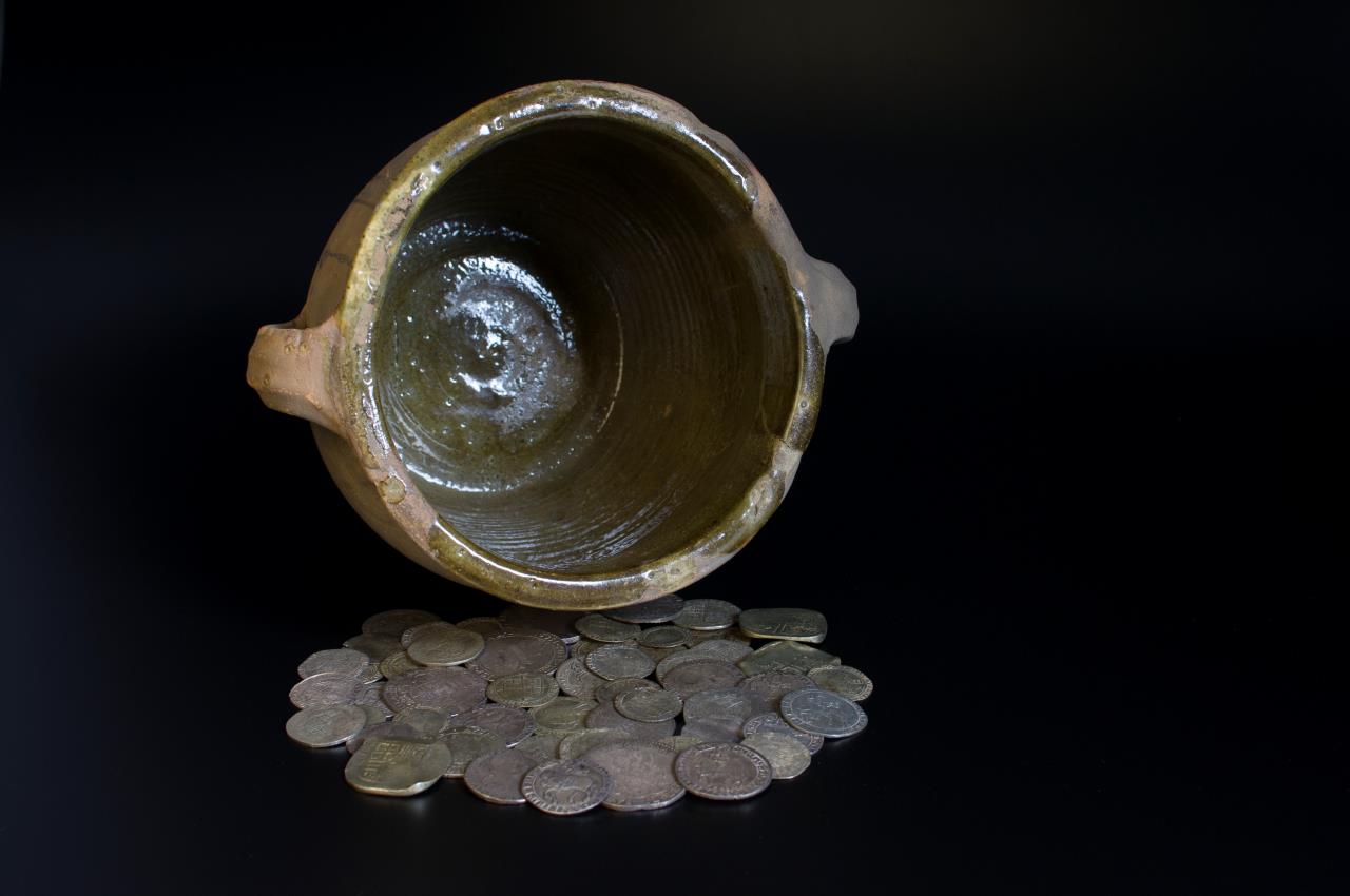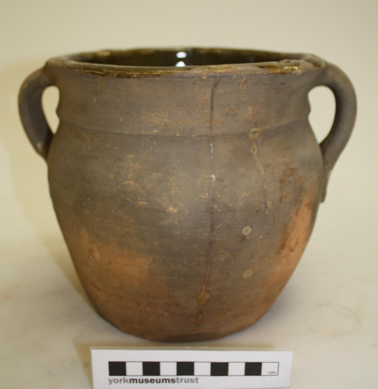 - Vessel with two handles and glossy olive green glaze inside. One of several vessels labelled 'Middleham hoard'.