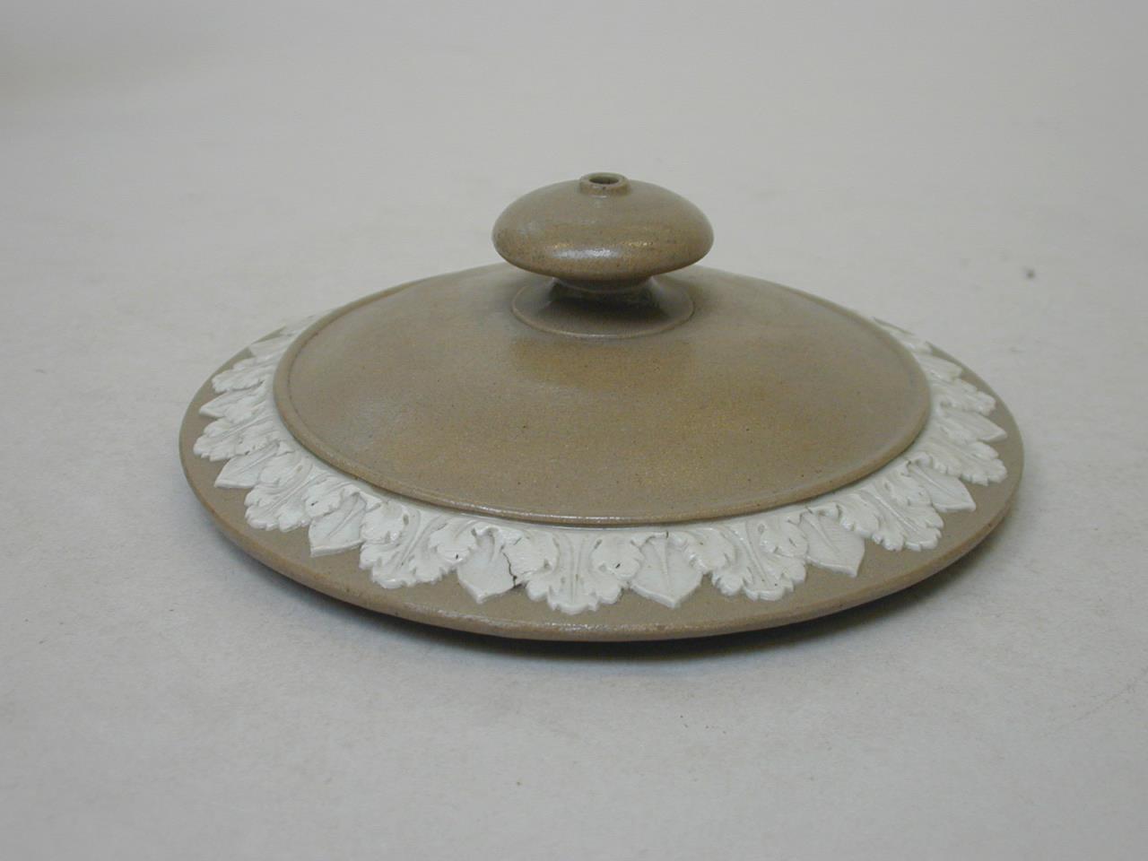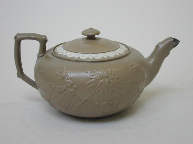A stoneware teapot and cover. The teapot has a round body and is decorated with a moulded pattern of flowers and foliage. The handle is moulded in the shape of a branch. The teapot has a brown smear glaze. The round cover with a mushroom knop is decorated around the rim with a border of foliage slip moulded in white.