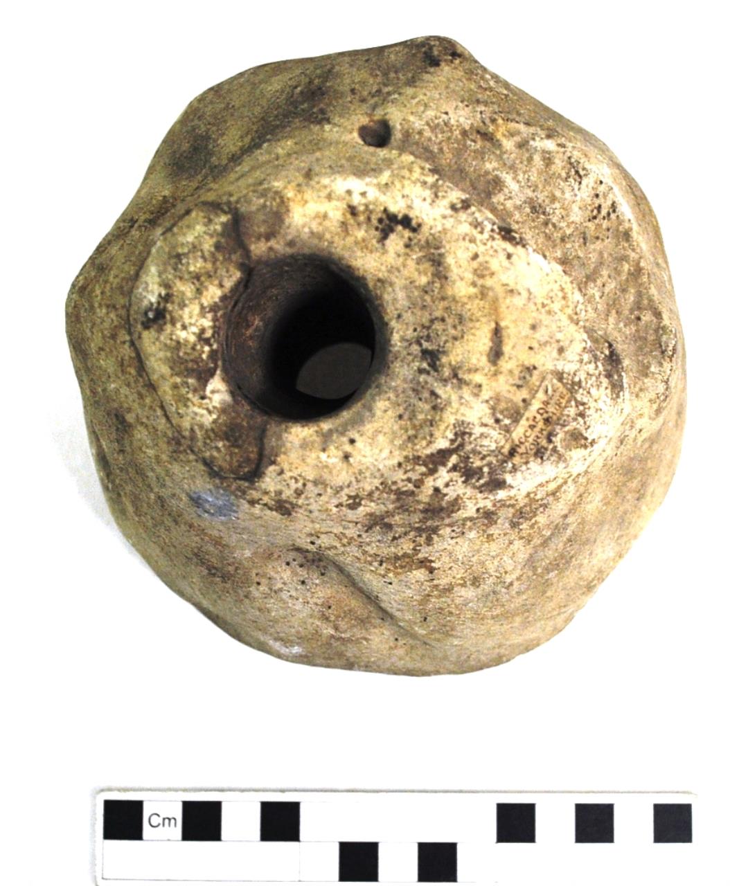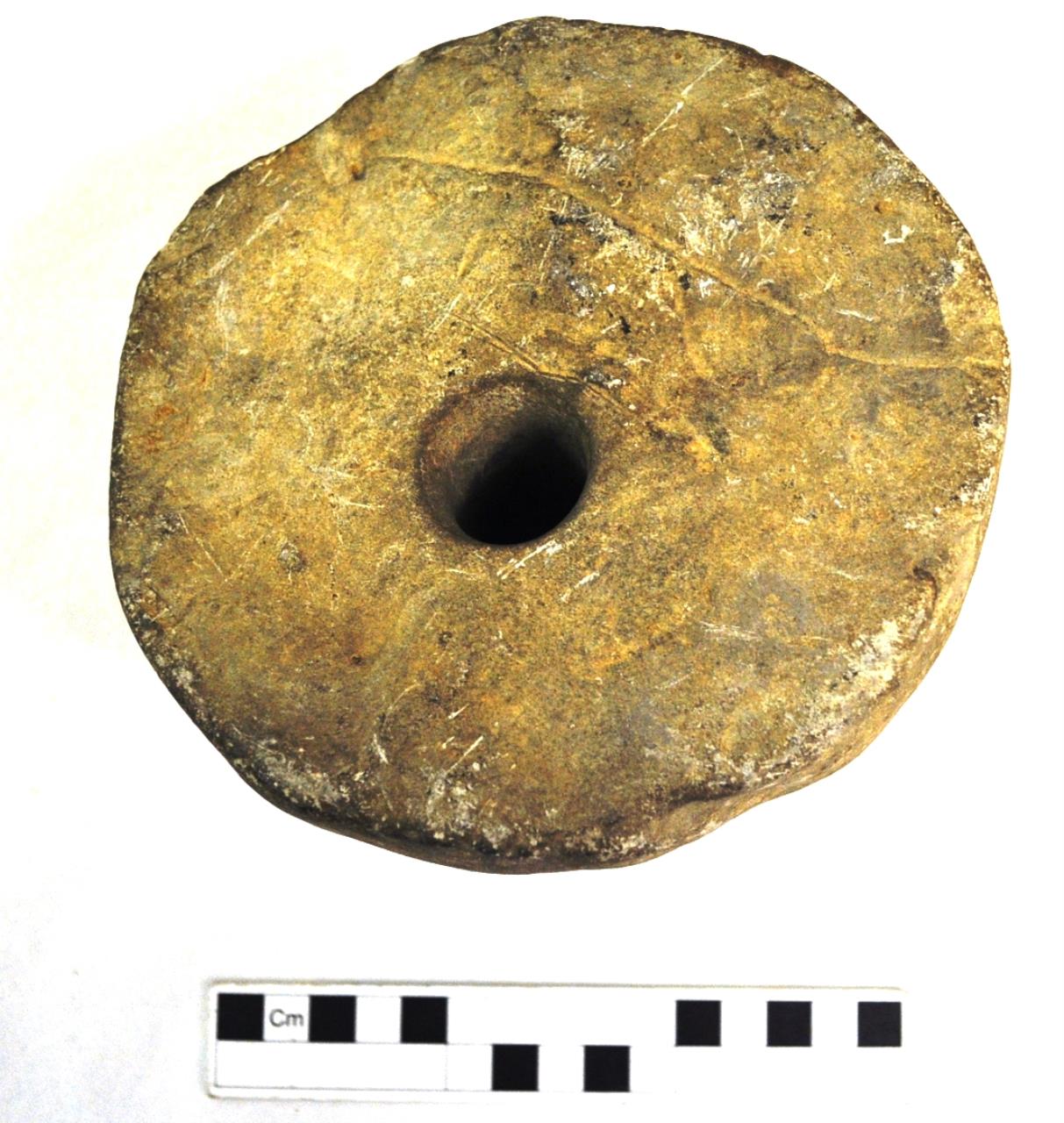 Conical hand rotary quern. Irregularly faced, with some damage. Central hopper perforation is diagonal. Underside worn smooth through use. Magnesian limestone.