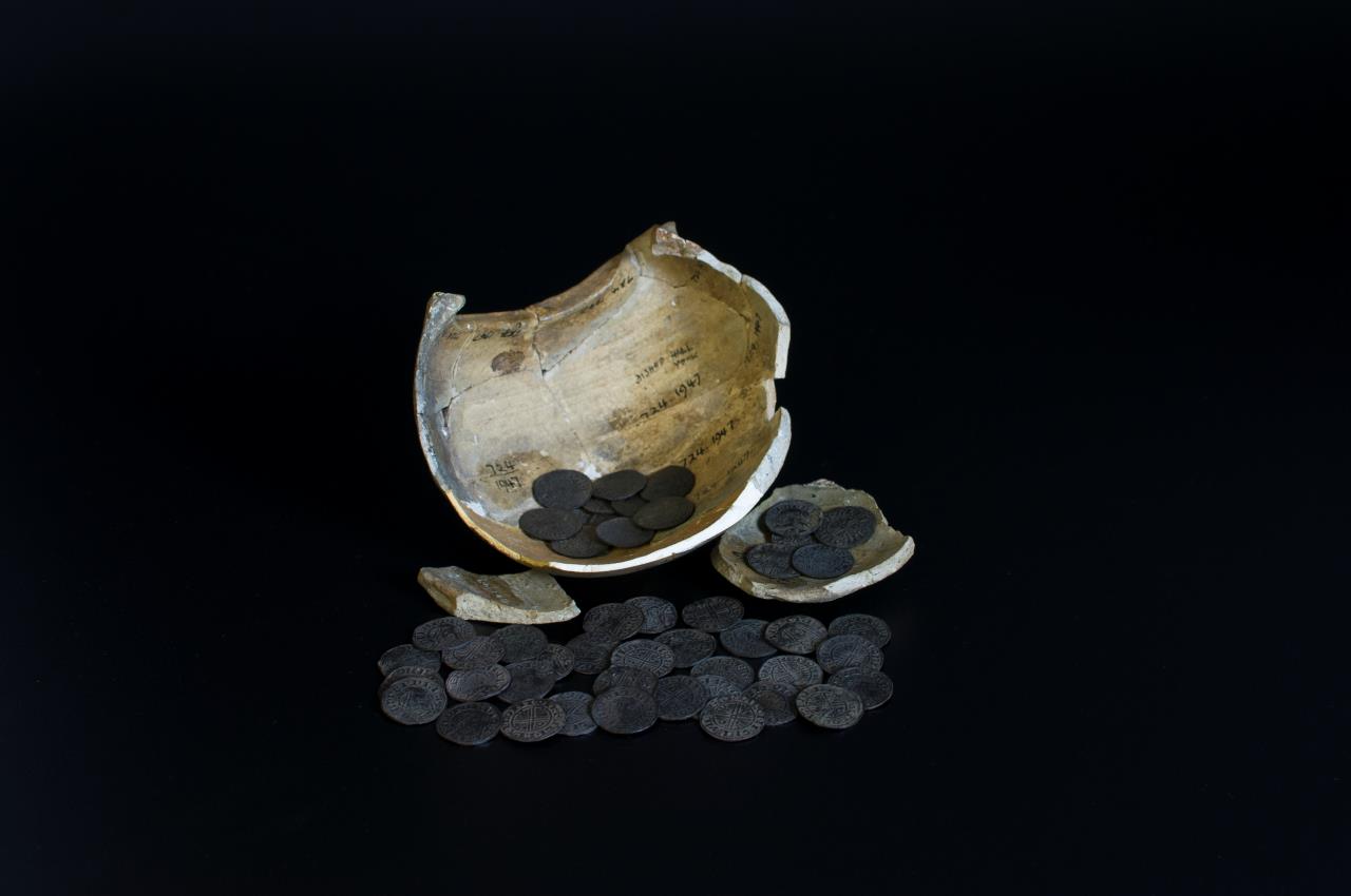 - Incomplete and part-reconstructed Stamford ware vessel with a pronounced spout, containing the Bishophill Hoard