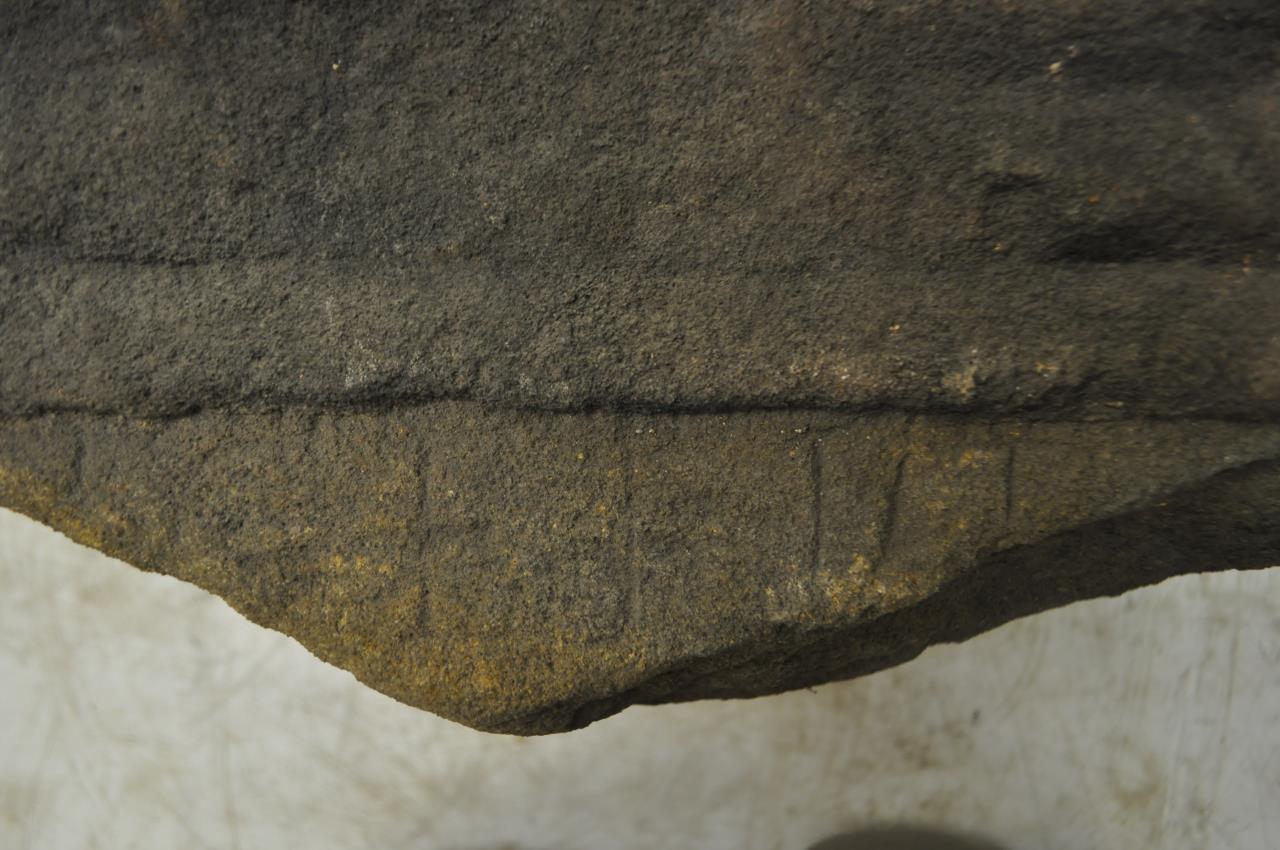 'Altar fragment, of gritstone, 23ins by 19ins by 14ins: only the capital and the top if the die are left. N[V[M(INI)] AVG(VSTI) E]T GEN(IO) EB[OR(ACI) 'To the emperor's divinity, and the Genius of York....' The Genius is the presiding deity.