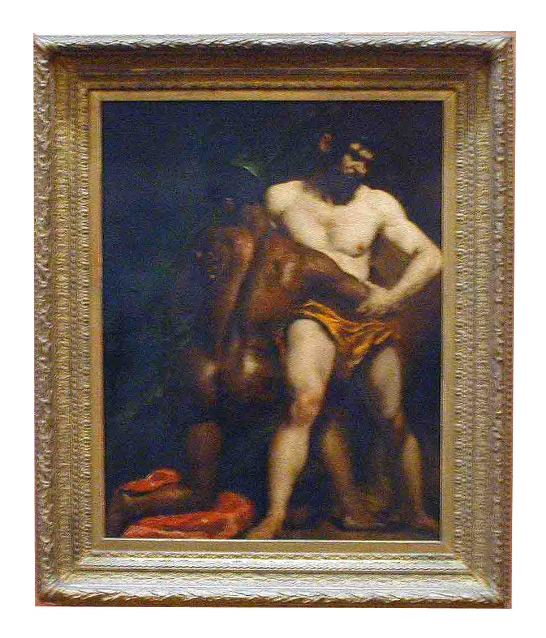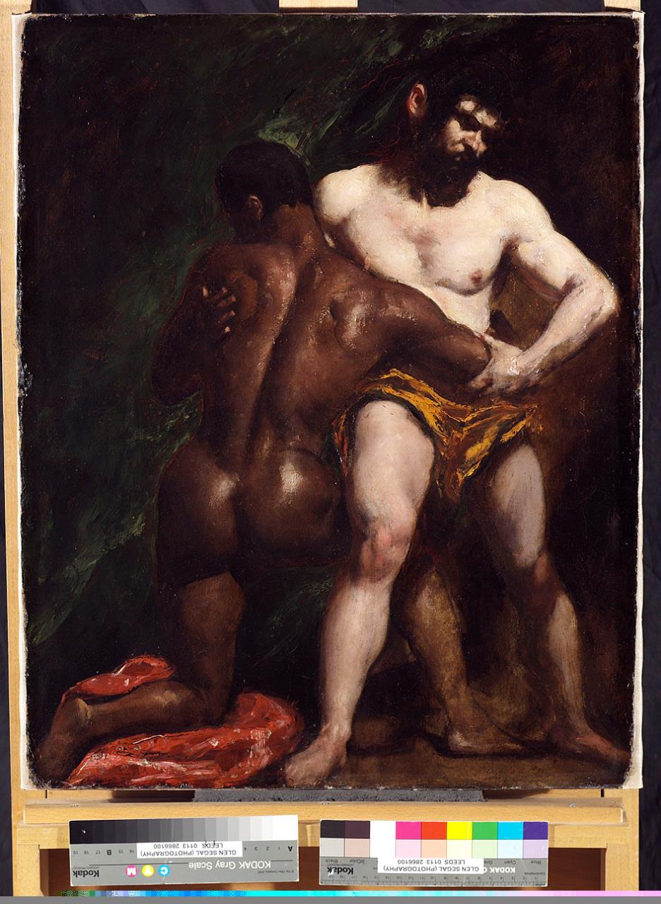 - Right, a bearded white man wearing a yellow loin-cloth wrestles with a black man, left, who is on one knee. Rich green background.
