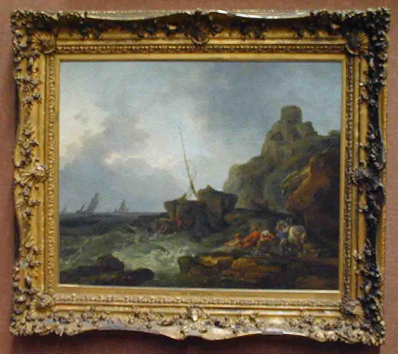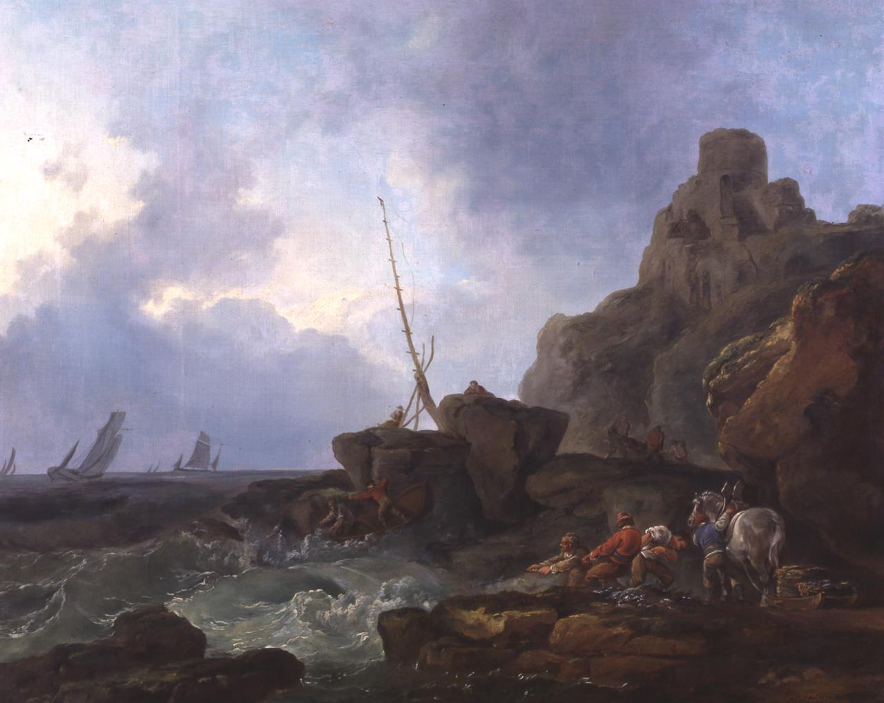 - A rocky coast scene; on the right a tower on a promontory. In the foreground, right, a small group of figures drags wreckage out of the sea; one holds a horse to carry off the spoil. Beyond are further figures, two in a little boat which is buffeted against the rocks. To the left four sailing ships on the open sea.