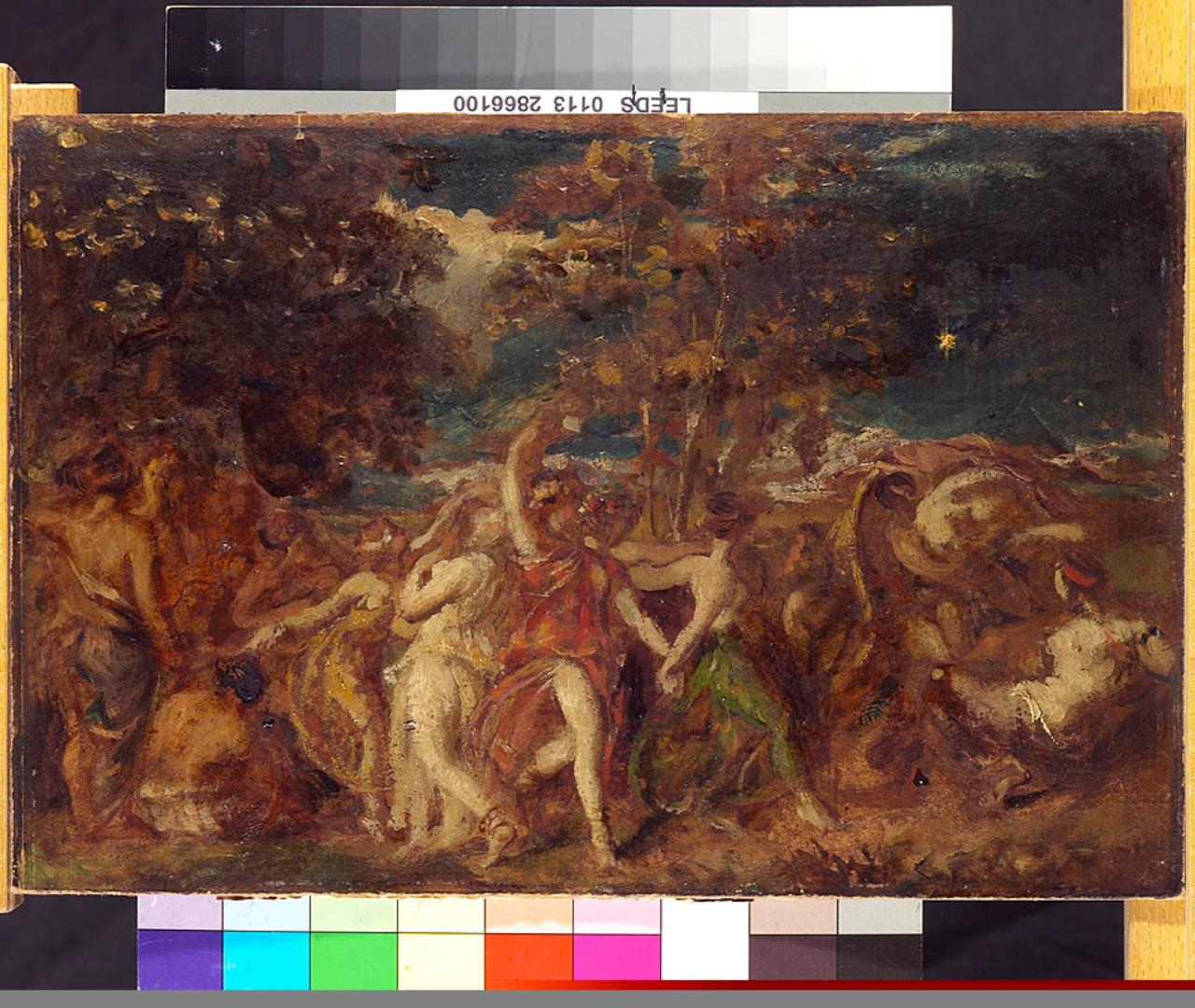 Sketch of lightly draped figures dancing in a landscape. Trees extreme left and centre.