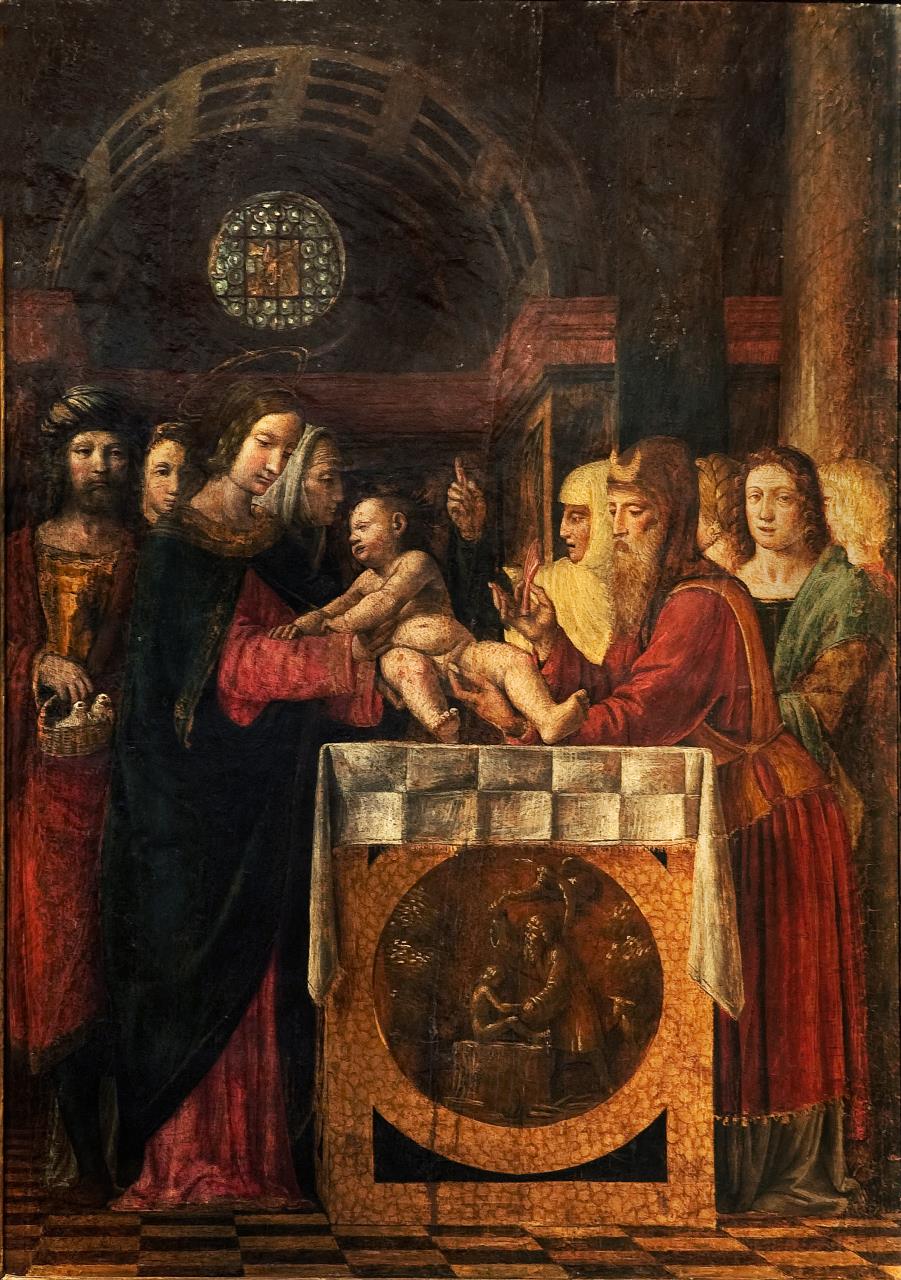 - The Virgin holds Child over a marble font, priest on the right; and left, onlookers; background of classical columns and niche; the sacrifice of Isaac is depicted in roundel form on the font.