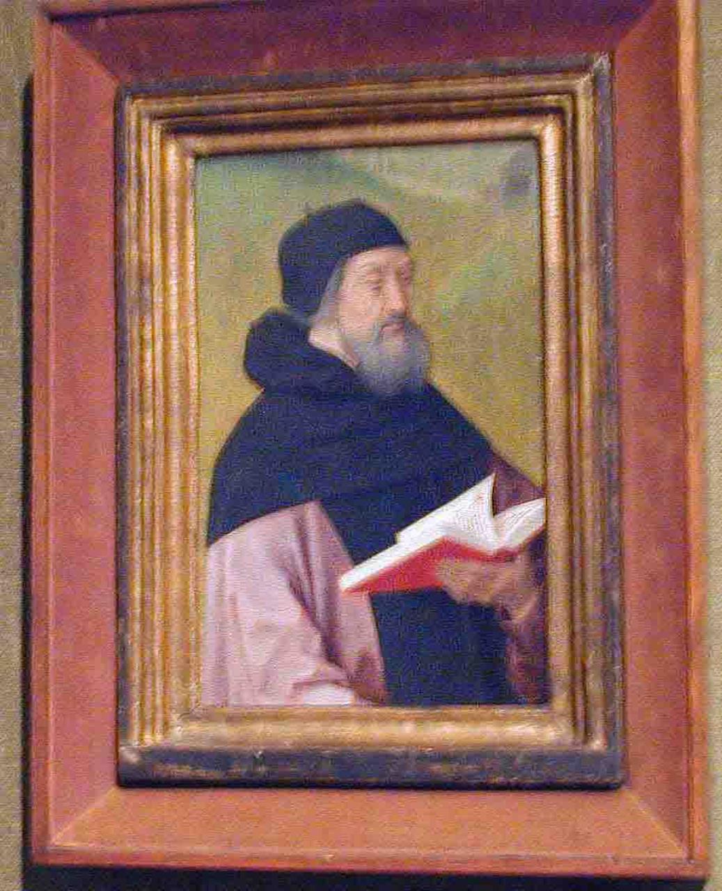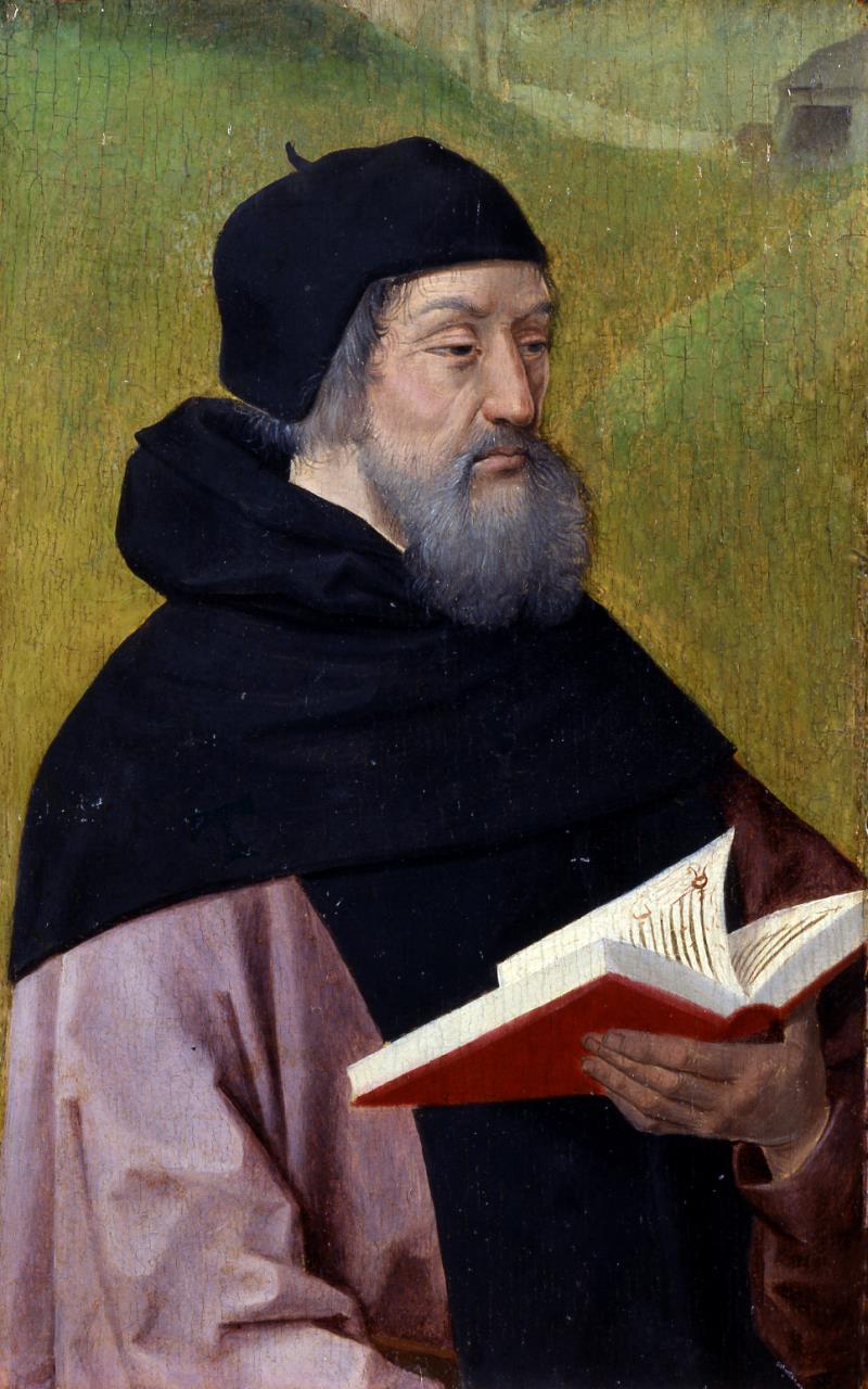 - A half-length figure of a bearded man with monk's cap, holding a book. Landscape background.