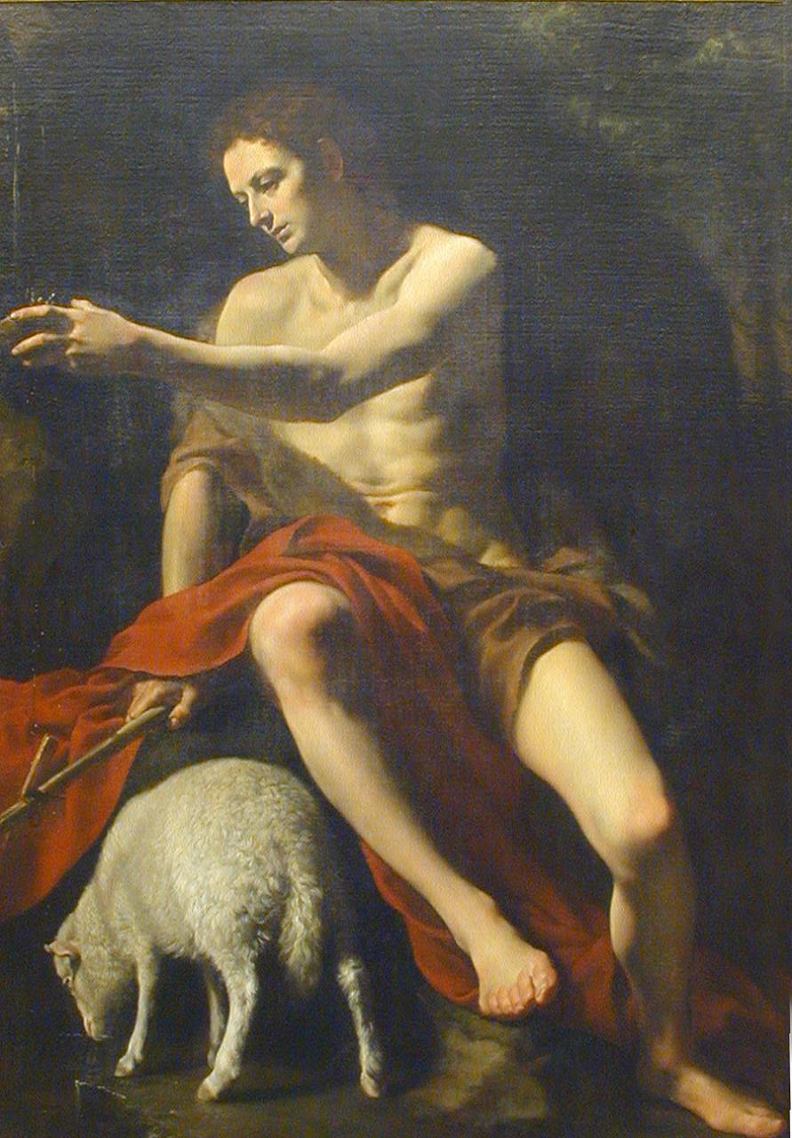 - Full-length figure of Saint John with short brown curly hair wearing a golden brown pelt with a red drape over his right leg, seated looking left, holding a wooden cross in his right hand by his side, and catching water falling from a rock in a cup held in his outstretched left hand; a white sheep in the left foreground with dark rocks behind; strongly lit from the left.