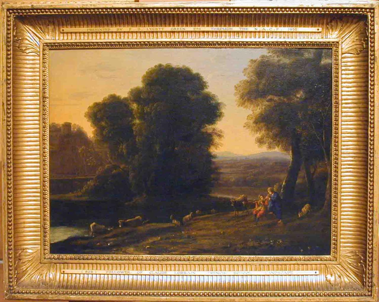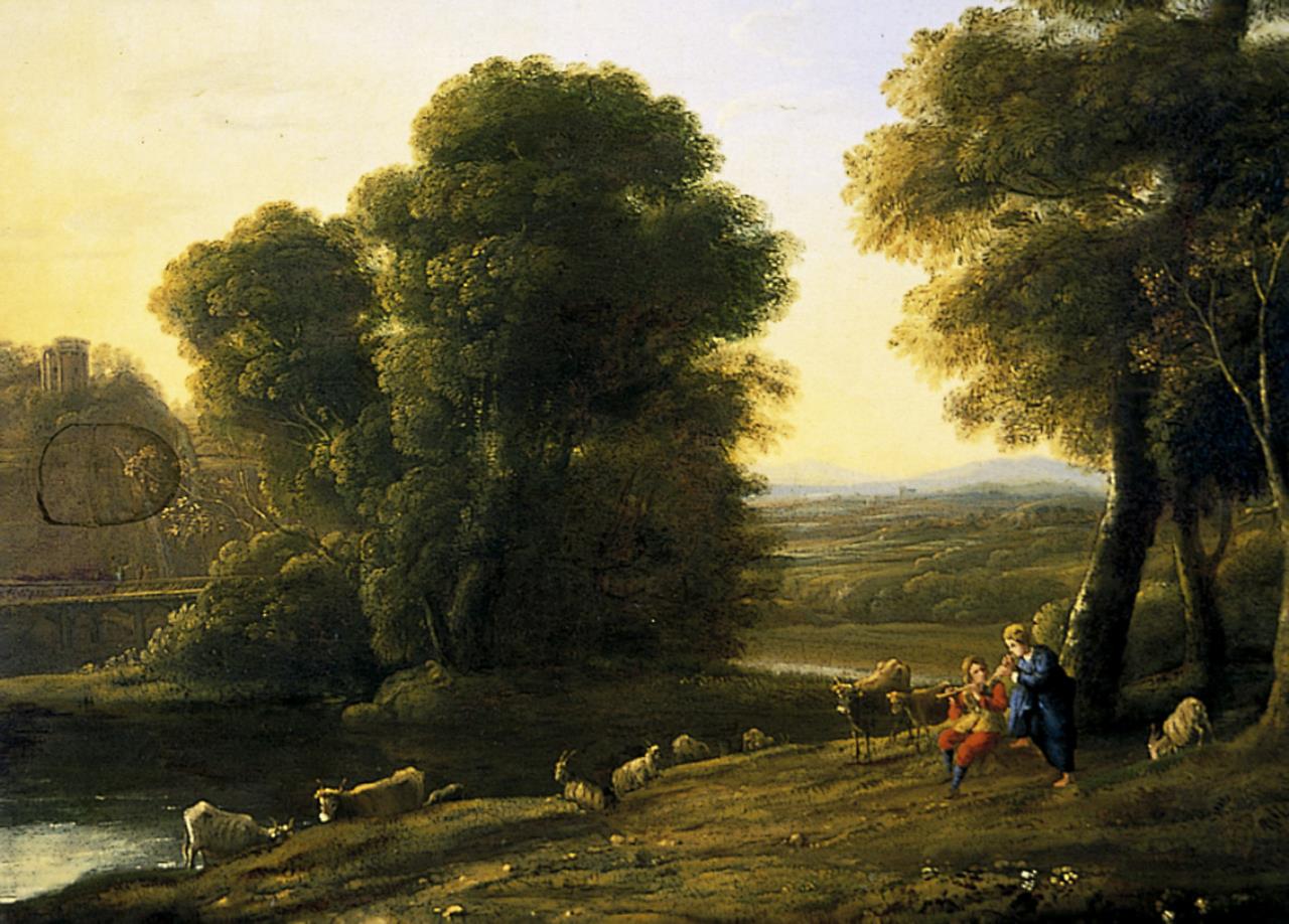 Left, river and trees; right, two figures playing flutes watching over cows and goats; landscape background.
