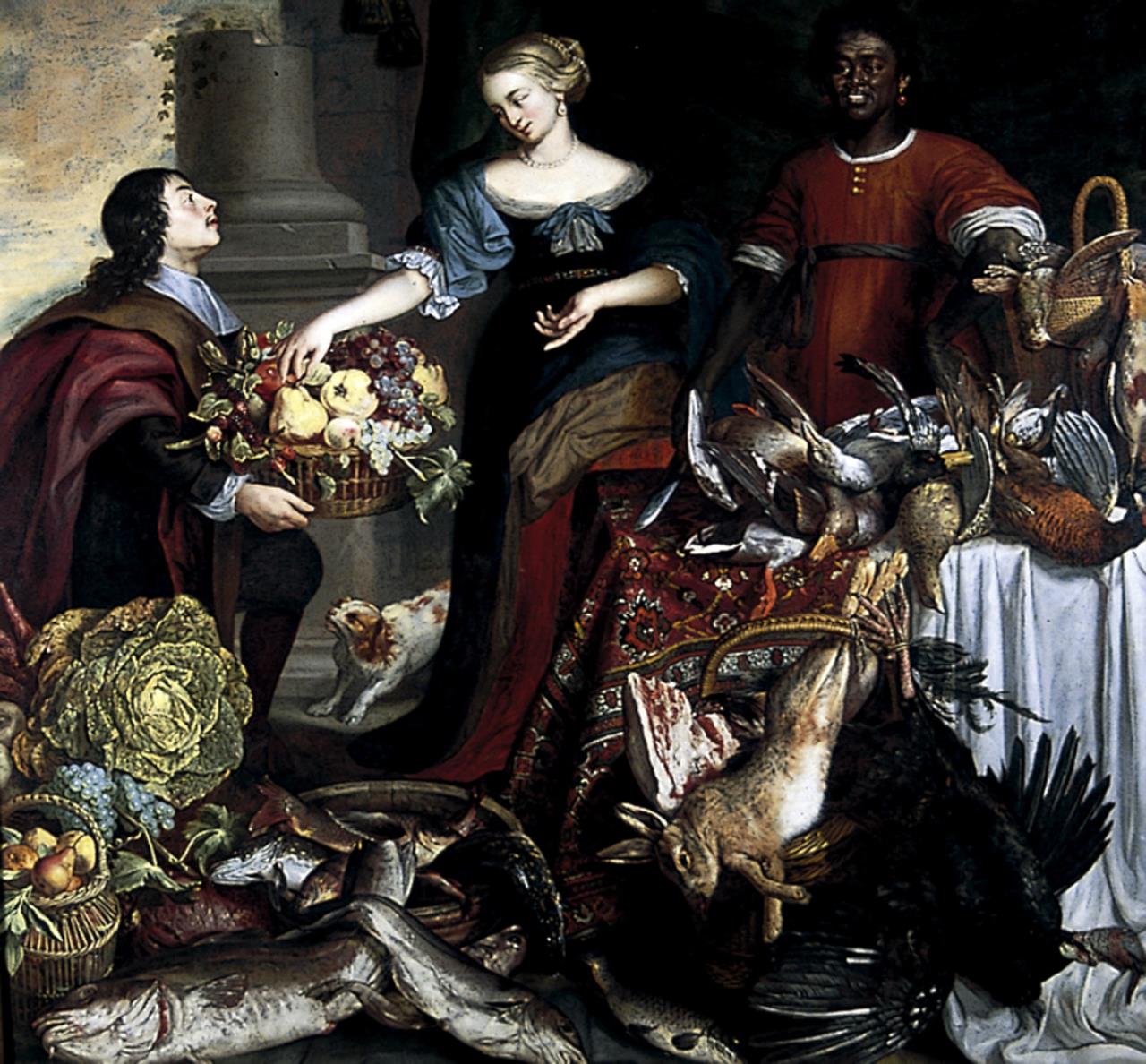 - A man, a woman and a negro (right foreground) stand behind an array of vegetables, fruit and game.