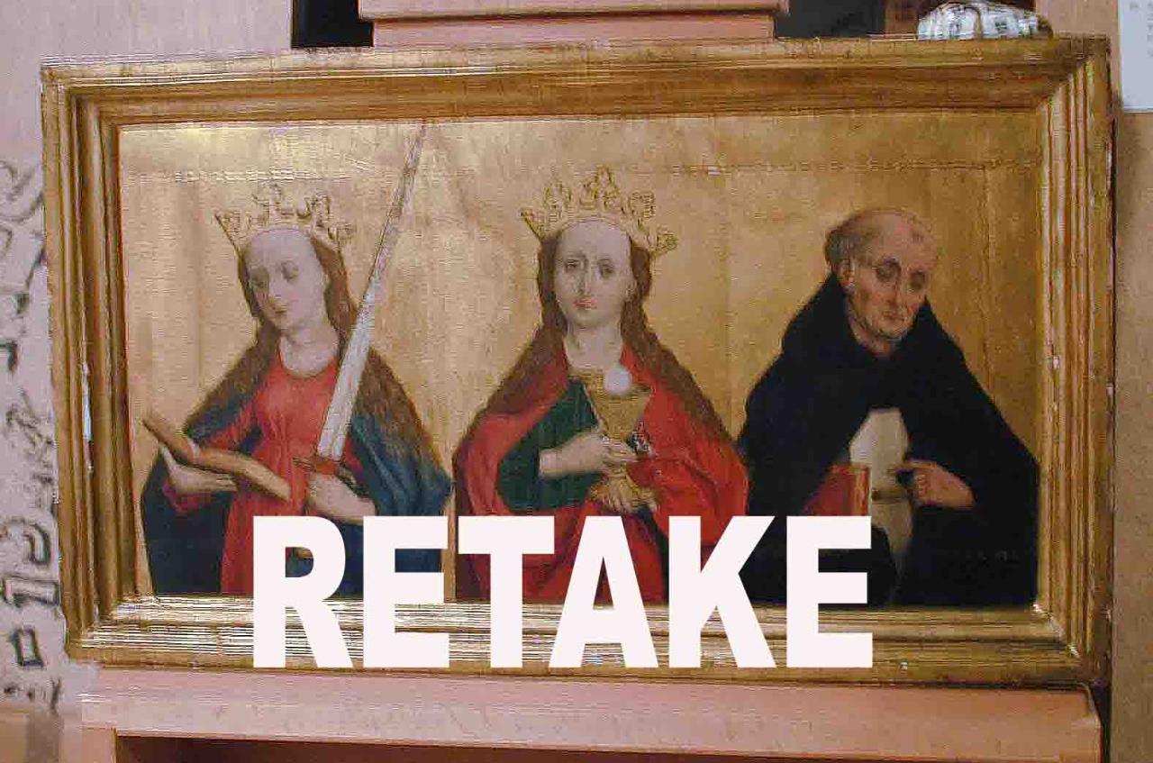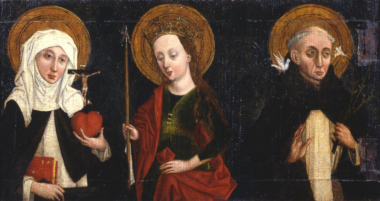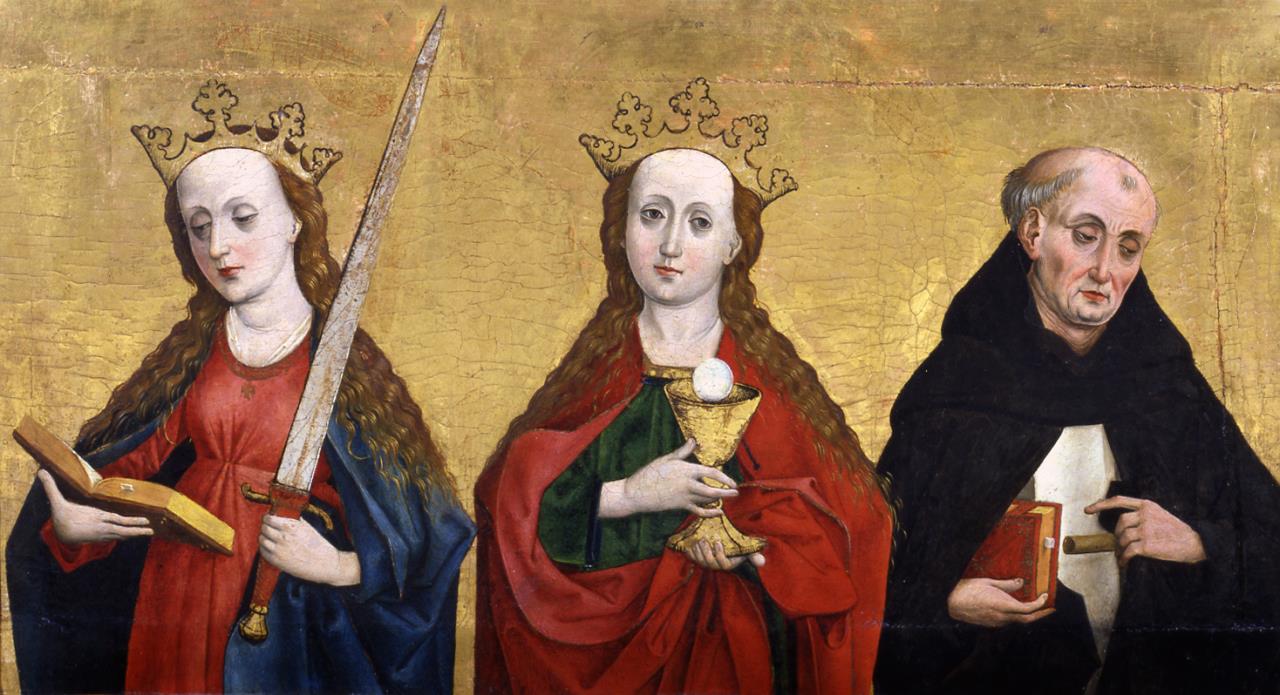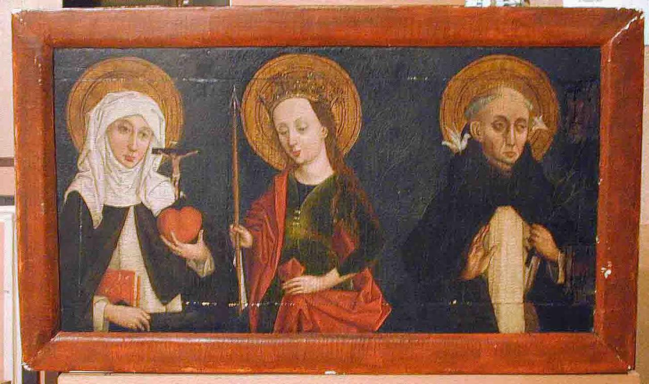 - (recto, on gold ground) Saint Catherine of Alexandria, with book and sword; Saint Barbara, with goblet and wafer (?); Saint Anthony Abbot, with book and roll of parchment: (verso, on the dark ground) Saint Catherine of Siena, with book, crucifix and halo; Saint Ursula, with arrow and halo; Saint Dominic, with lily (?).