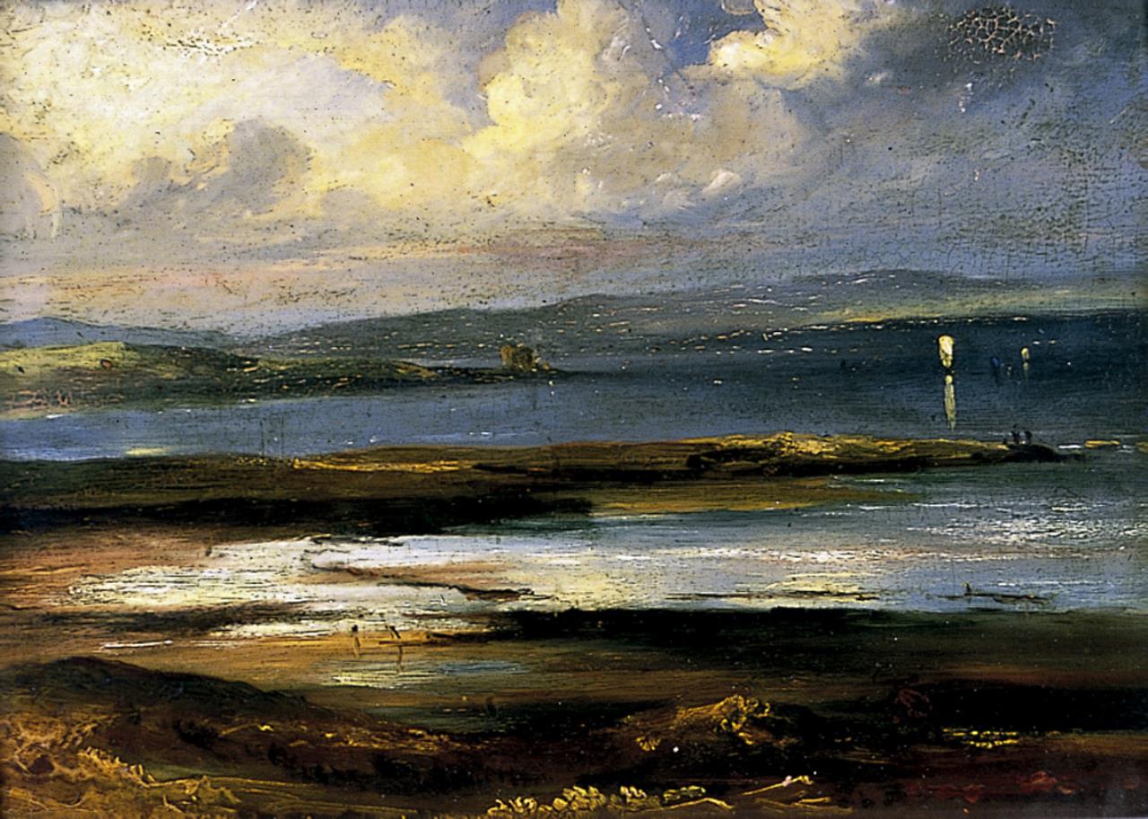 - Ruined castle on a hill, left, with open landscape to the right containing two small figures.