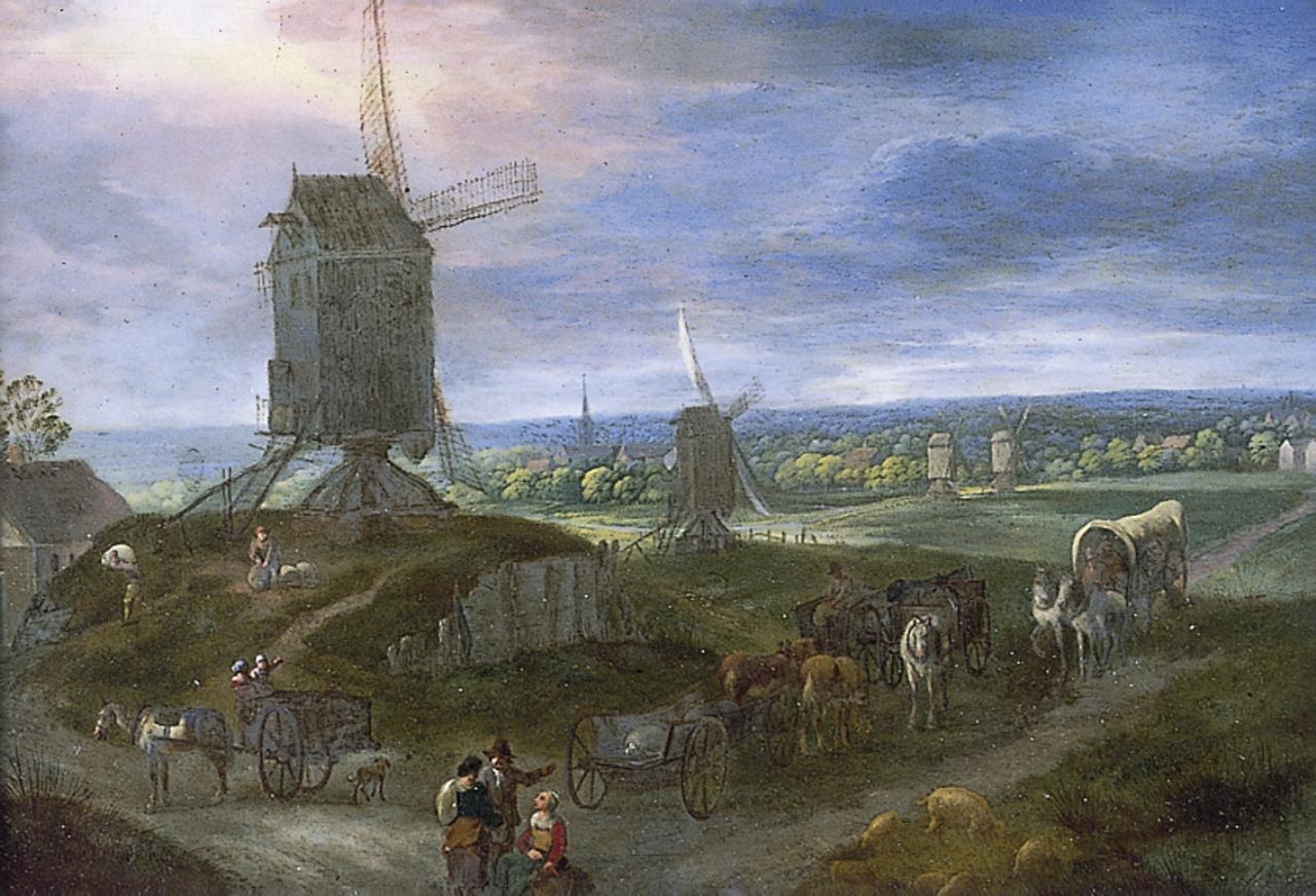 - In left foreground, a windmill; on the right, a trail of figures and donkeys; in the background are more windmills.