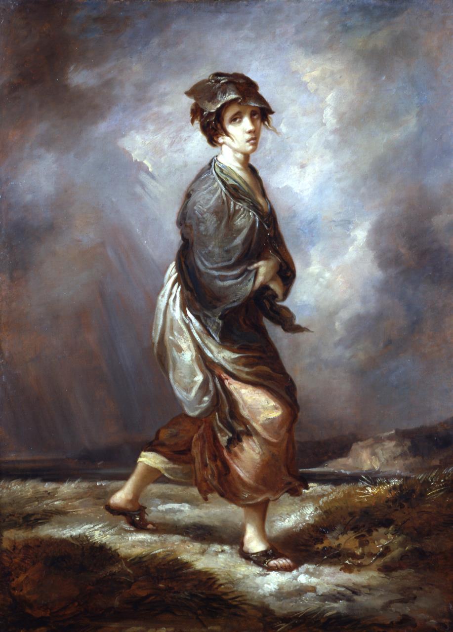 - A forlorn girl, looking right, in a tattered dress tramps across the open dunes by the sea. There is a menacing sky.