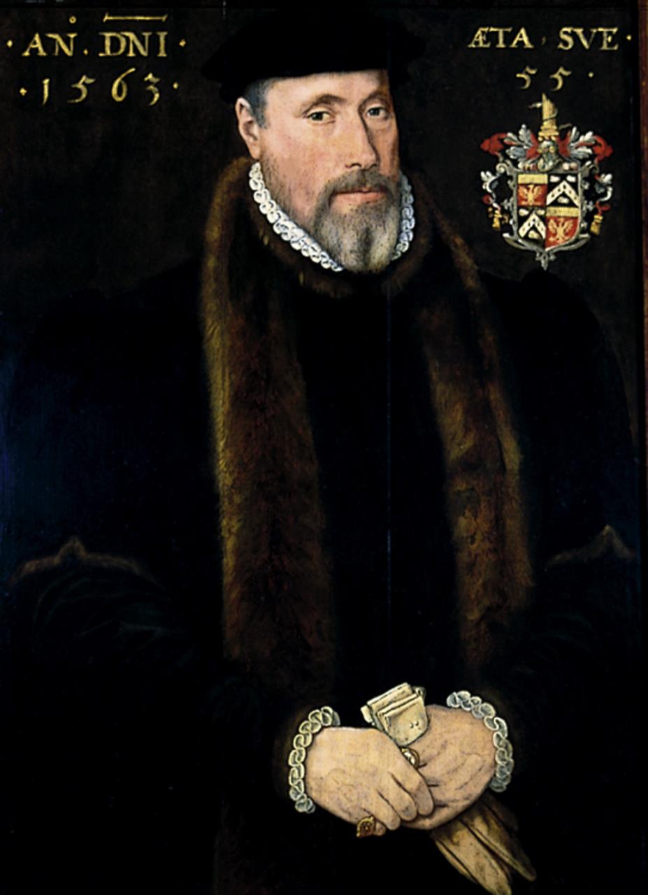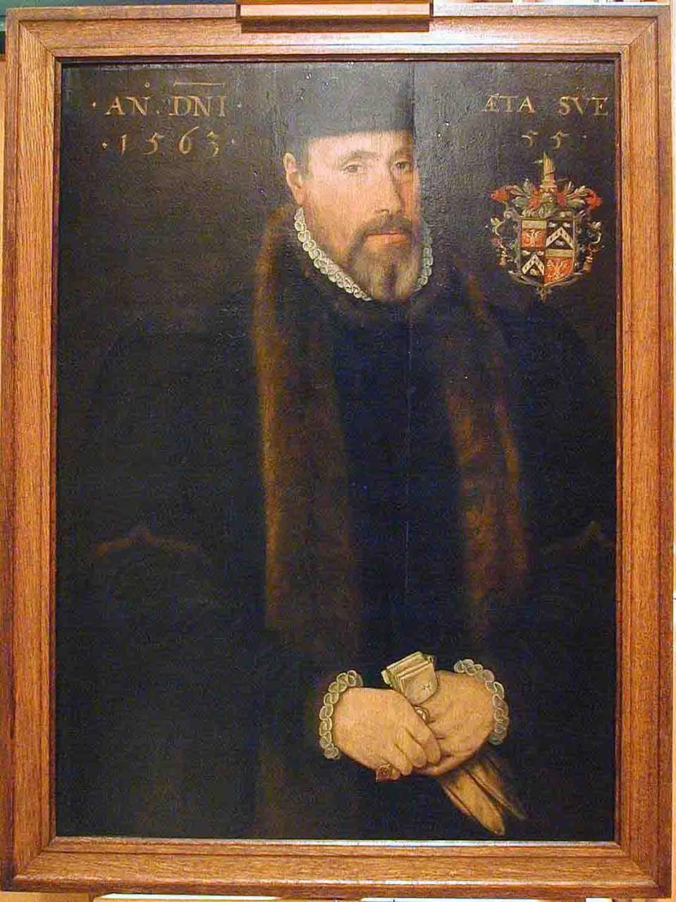 Three-quarter-length middle-aged man standing slightly to right, his gloves in his clasped hands; he wears a black gown edged with fur; inscribed, above, AN.DNI/1563./AETASVE./55. ad with arms, right (quarterly of Harrison and Ninessor, with crest, on a torse, or and gules, a broken pillar, or, entwined with a serpent, vert).