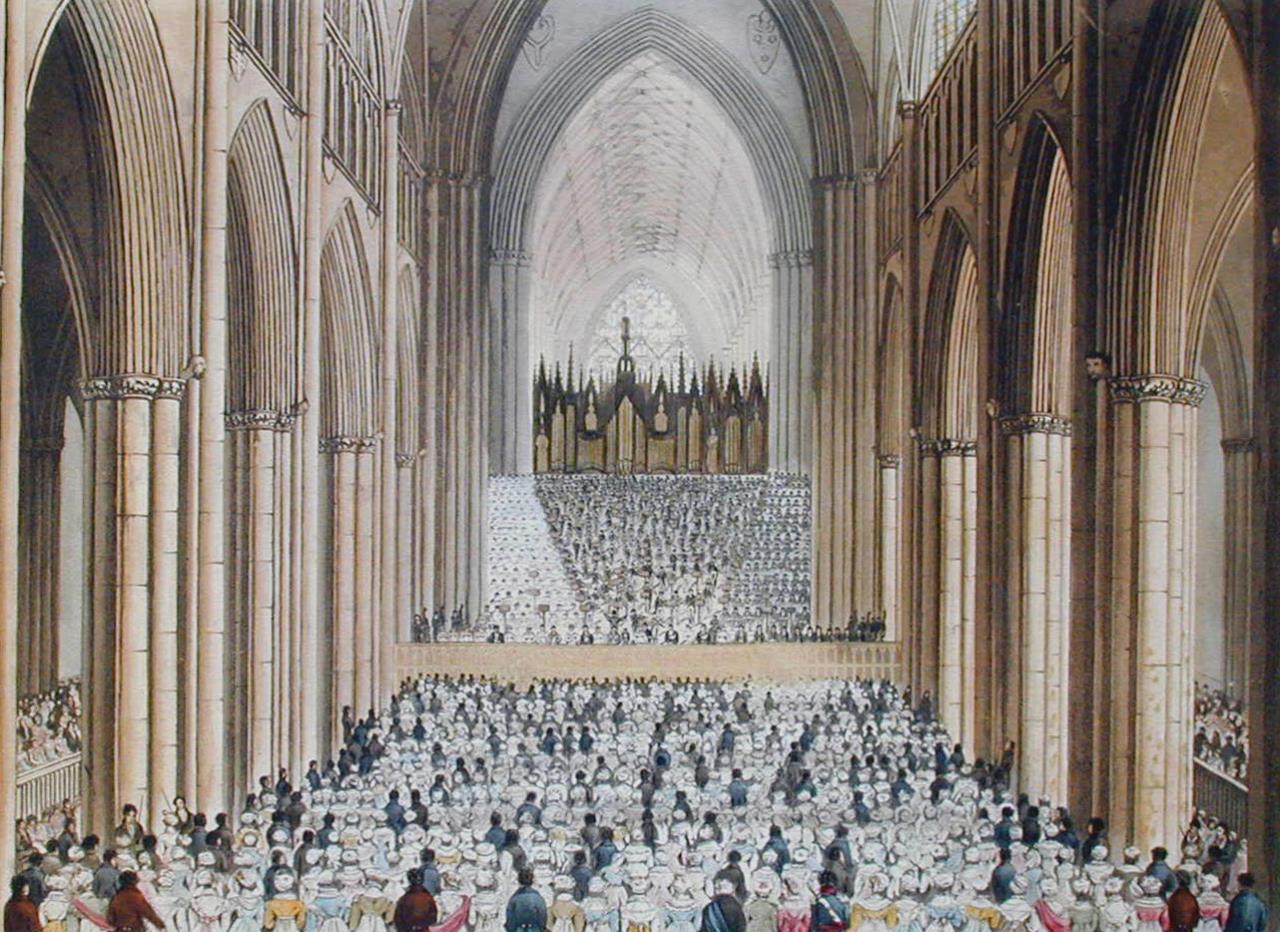 - A view of the interior of York Minster with crowds watching an orchestra beneath the Great Tower. The view is an engraving coloured with watercolours.