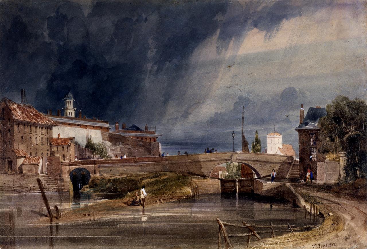 A view of the Castle Mills Bridge, showing the corn mills, under a stormy sky.