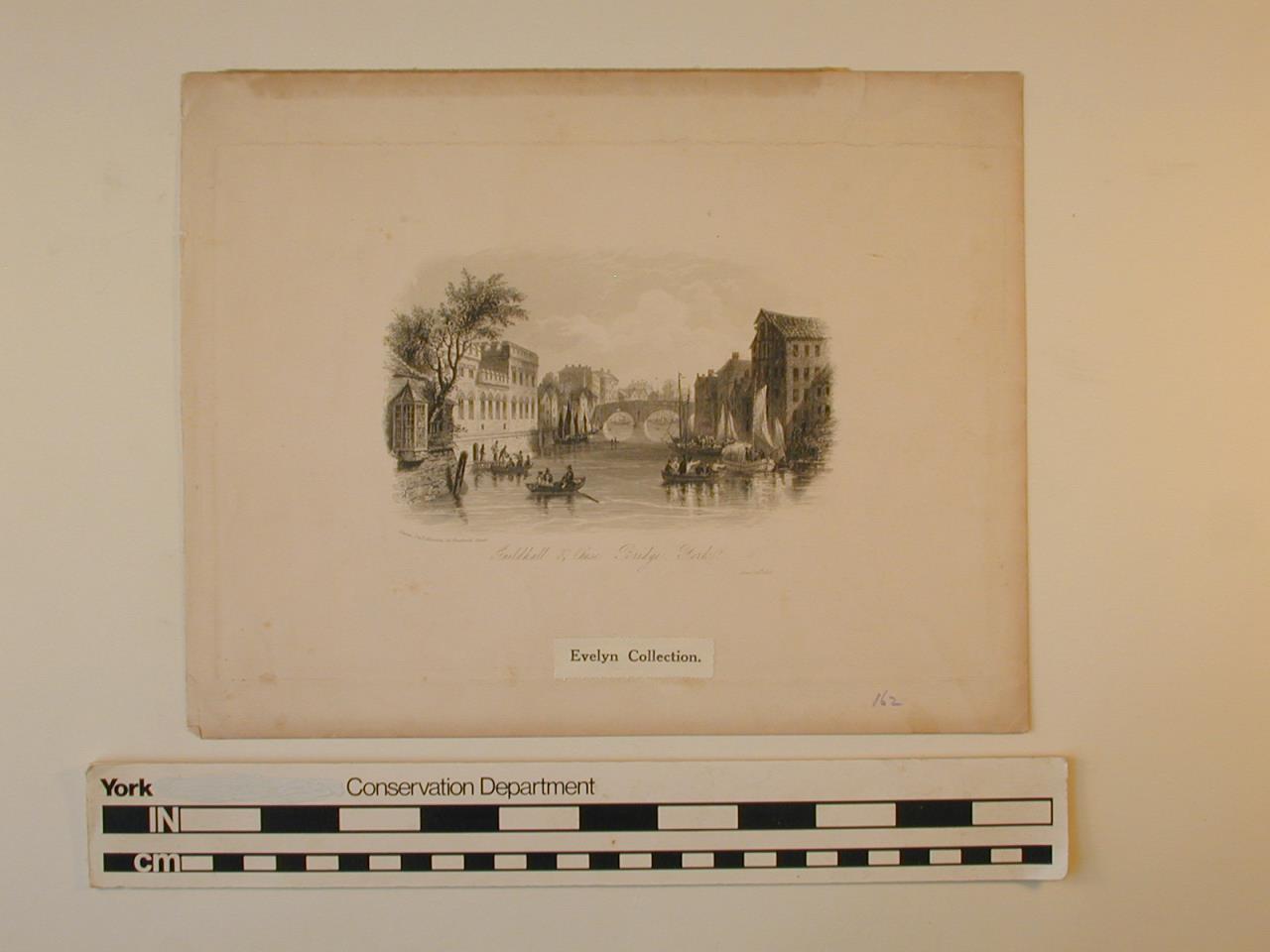 - A view up the River Ouse, with the rear of the Guildhall, on the left bank and the Ouse Bridge in the centre middleground. Boats are busy carrying people on the river in the fore and middlegrounds.