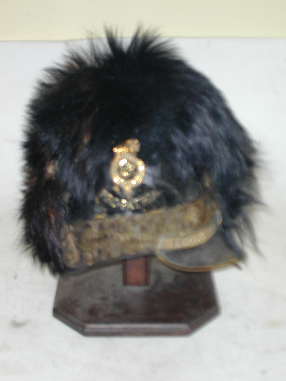 Tarleton helmet used by the Leeds Volunteer Cavalry. Comprising a metal helmet with a high comb covered in either fur, bearskin or horsehair. On the right side is the Royal Cypher of King George III. A hardened leather fall with an edging of brass strip completes the front of the helmet. The areas of metal which can be seen are black.