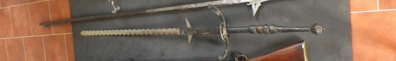 - Large sword with double edged blade of lozenge shaped section with no fullers, from the point it gently tapers then narrows to an edgeless portion above an outer guard of upcurved crescent shaped blades, below this is another section without an edge covered in leather then the hilt. the hilt comprises a large pommel , long handle and cross guards of flat section cut to make two curliques near each terminal and one each side of the blade, there are also rings on either side of the guard. Blade marked with a wolf and stamped "IHS IS"