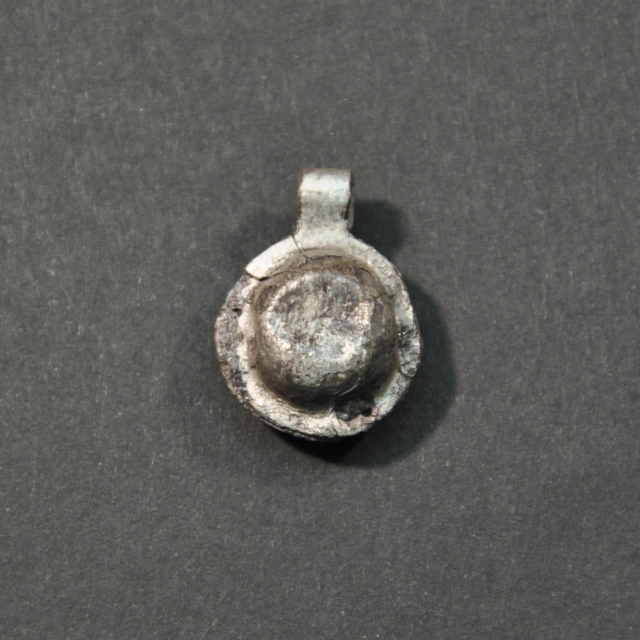 Flattened hemishere at either end of the strip, bent in half to form a closed amulet. Eboracum describes this grave group and the circumstances of the find: "Coffin and grave goods, found in 1901 at the N end of Sycamore Terrace, about 2ft from the S boundary wall of Love Lane (NG 5968 5236). The stone coffin, with a ridged lid, already broken into three pieces when found, contained the skeleton of a woman 5ft 4ins. tall lying on her back. The grave goods H5 -12, consisted of a dark blue glass flagon with applied threads on the neck, an open work inscription in bone, SOROR AVE VIVAS IN DEO "Hail sister, may you live in God" two jet bangles, a bracelet of blue glass beads, fragments of five bone bracelets, silver and bronze lockets, two yellow glass ear-drops, two marbled glass beads, and a small round glass mirror. This burial is often described as Christian."