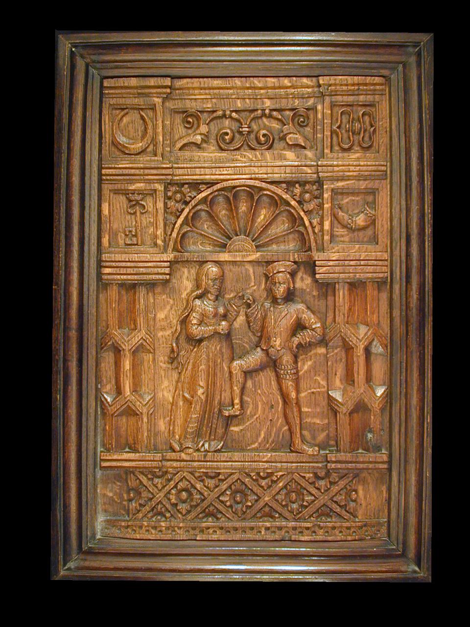 A carved oak panel depicting a dancing couple. The lady is wearing a long gown moulded to the figure down to a high waist, the skirt extending over the hips in ample pleats. She is holding something round in one hand, the other hand is holding hands with the man. She has long flowing hair with no headdress of any kind thus showing that she is a maiden or bride. The man has on a cap, a collarless shirt and doublet, a cod-piece and decorative hose elaborately puffed and slashed across the thigh. and square toed shoes. Carved above the couple there are four Percy badges, the crescent moon, the crowned key, the bugle-horn and the pair of manacles.