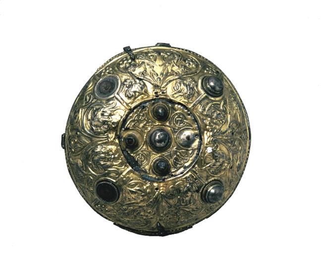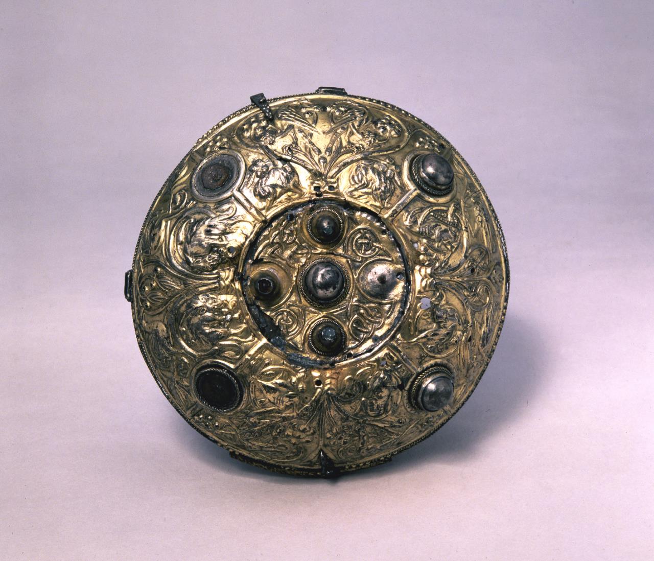 - Silver gilt with repousse ornament on outside. Inner shell studded with blue glass and silver wire interlace.