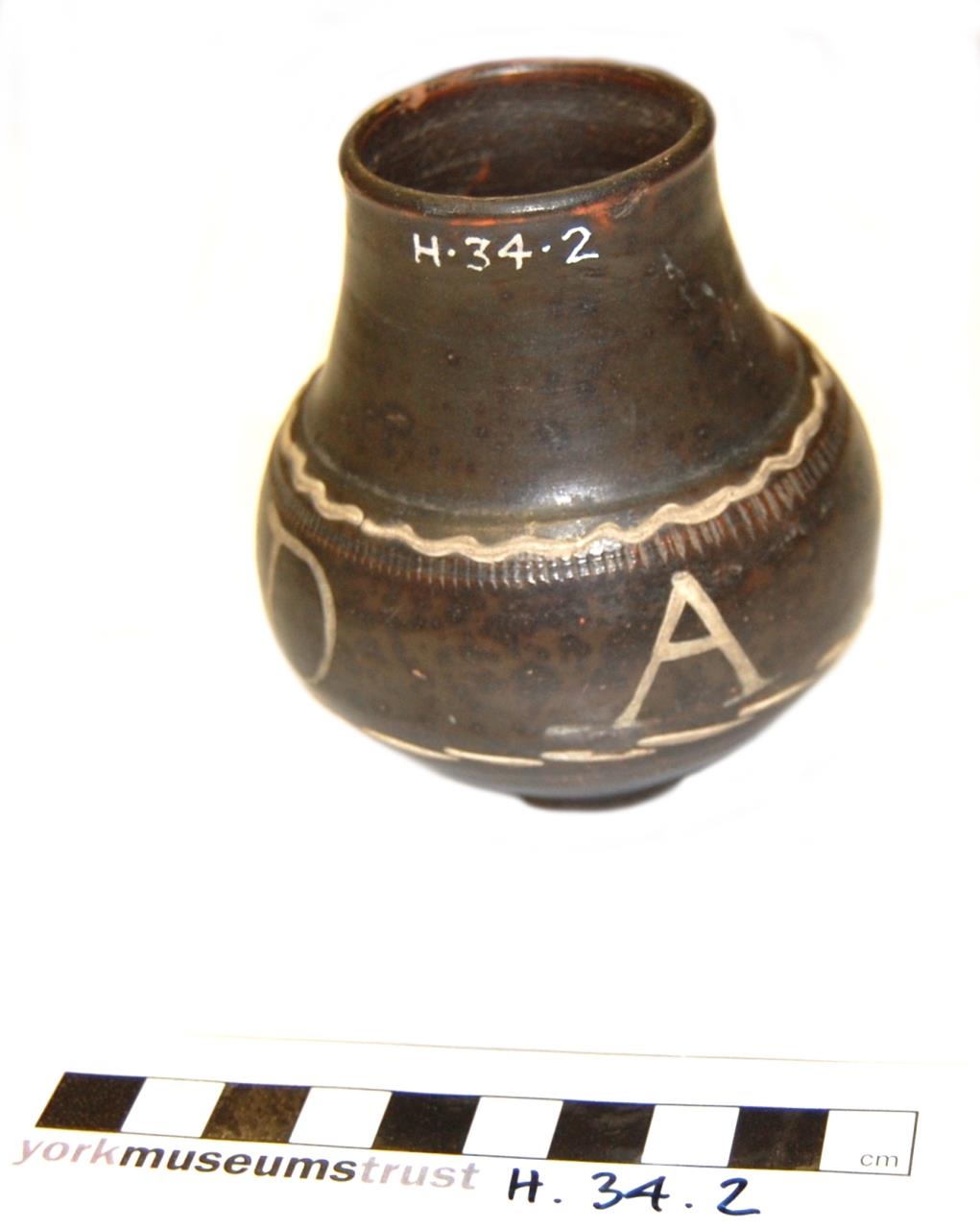 Motto Beaker; Form KE (globular pedestal beaker with elongated neck). Decorated with rouletting below the neck and white-paint with the letters DAMI ('drink me'). Trier Black-Slipped Ware.