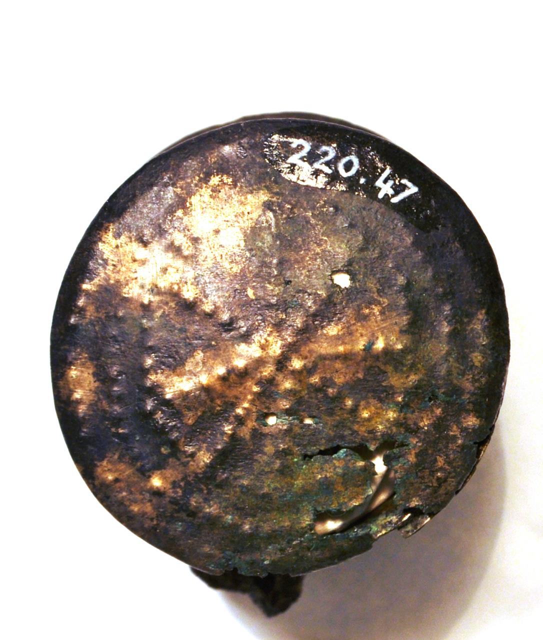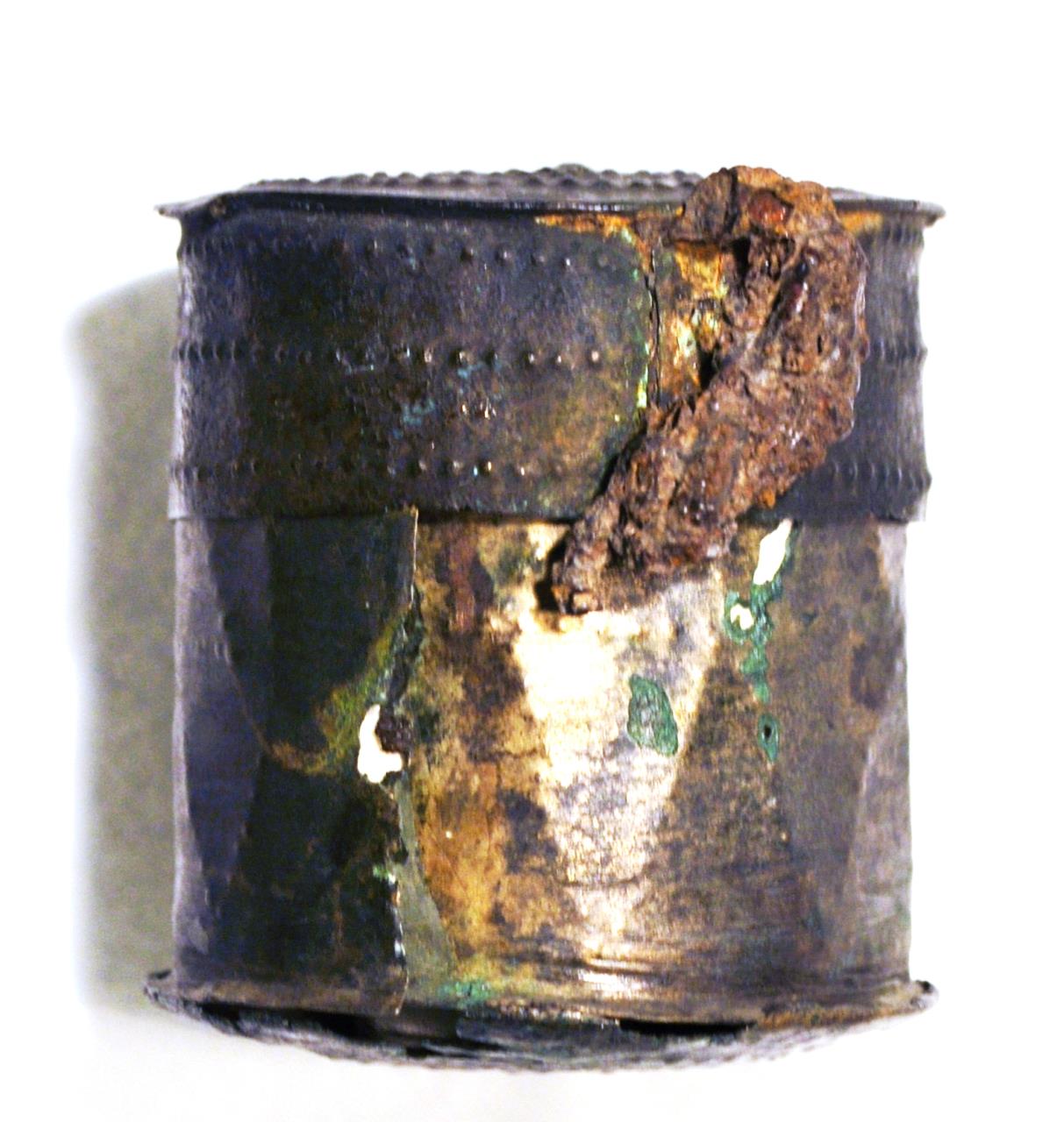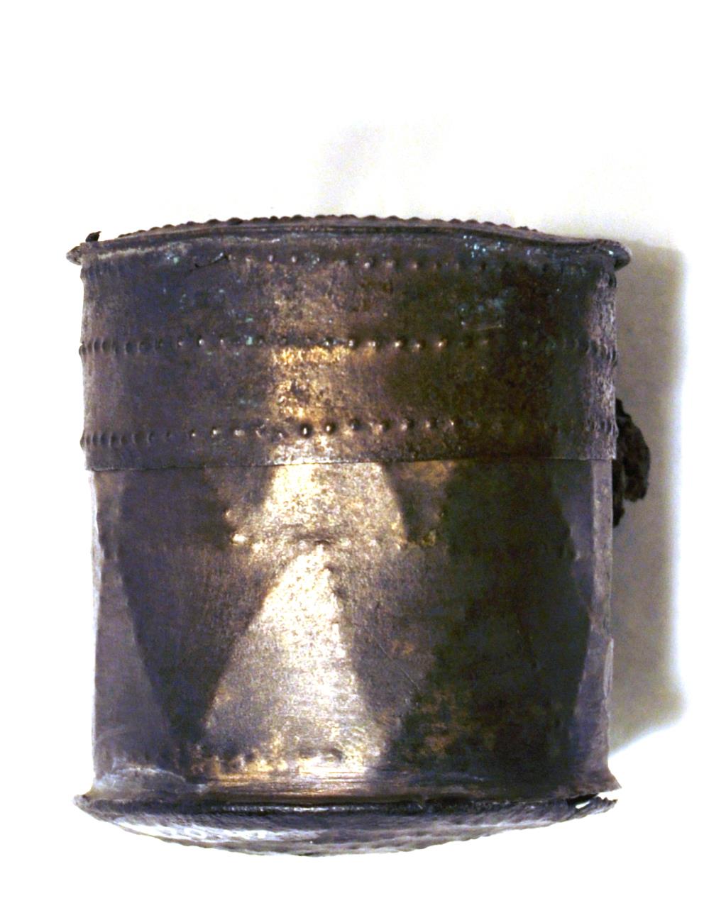 Cylindrical workbox with punched concentric circle design on the surface of the lid which is slightly convex, and bands of punched dots on the body of the lid, remains of a chain attached. The body punched with dotted herringbone running acrocss the body of the vessel. Attached is a slightly curved base with a punched cuciform design surround by punched concentric circles. Inside the workbox were threads YORYM:1947.220.1