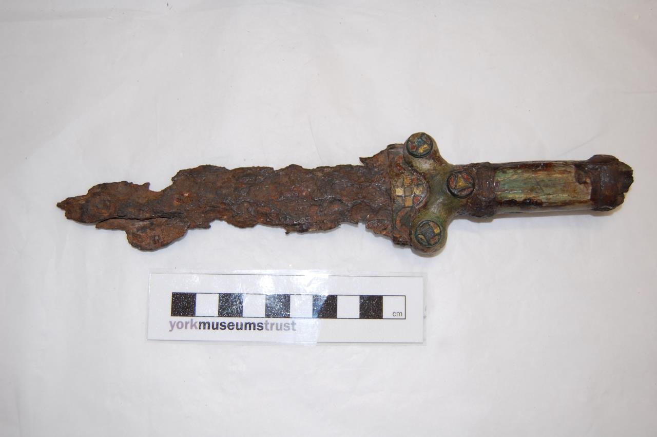 Hilt and upper part of blade; the handle is made from bone and is decorated with circular studs inlaid with glass.