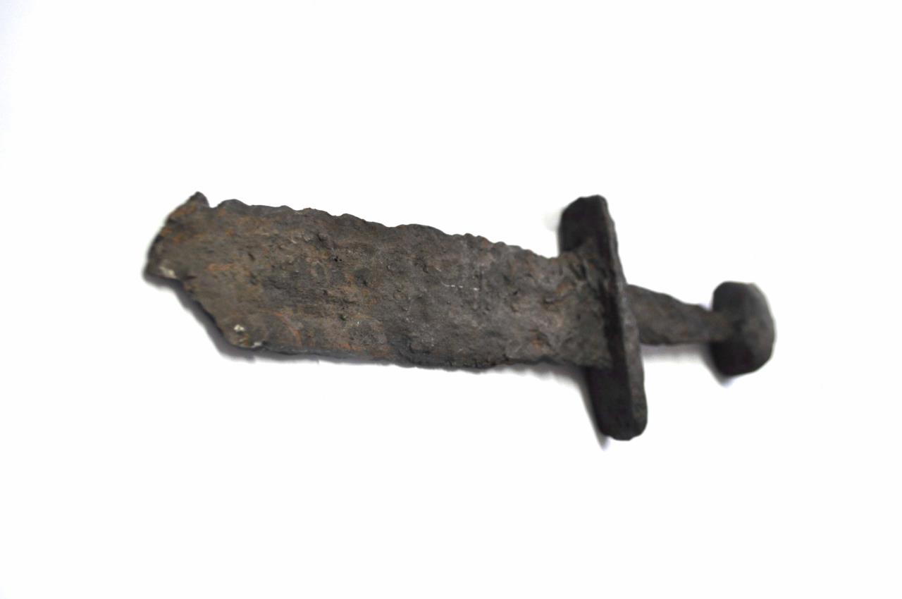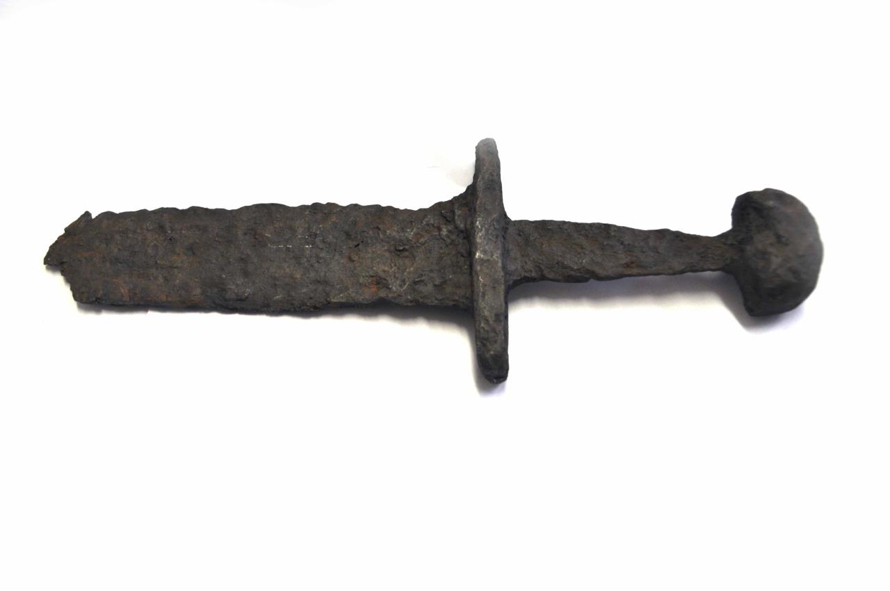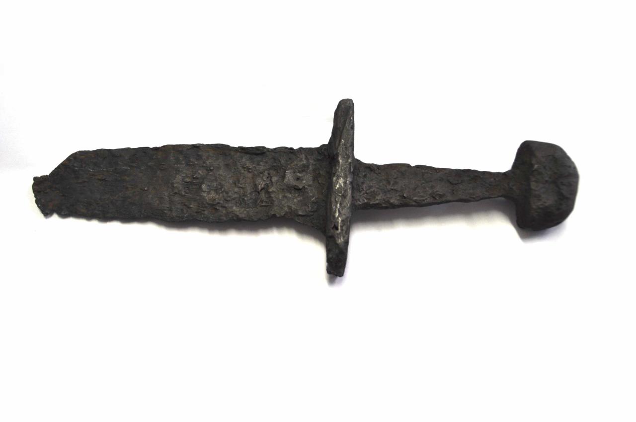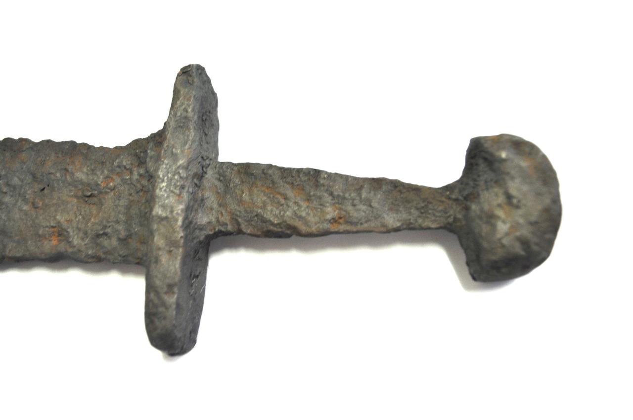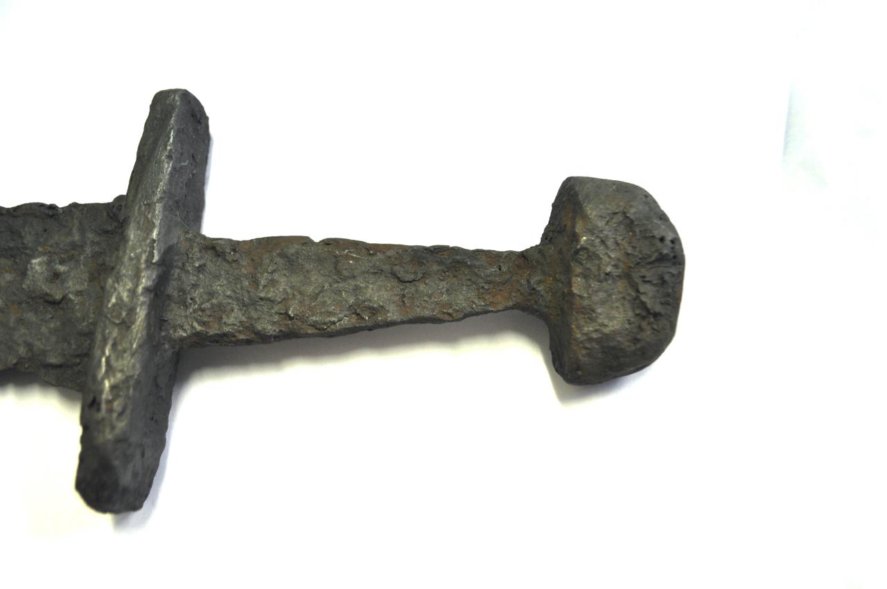 Double edged, straight guard, semi-circular pommel. Displayed with replica. Handle very worn. This sword is the longer of the two described in Waterman, D 1959, pp. 71-72 (fig 5.1): ' Weapons of Viking type found in York are surprisingly few in number and consist only of two swords...The swords (fig.5.1,2) are of identical form, with semicircular pommel, straight cross-piece of rectangular section and two edged, fullered blade. They are of Petersen's type X, which in Norway was current in the tenth century but which may have persisted later in this country. In England, the distribution of this type of sword with simple plain pommel seems to be northern but is of limited occurance. '