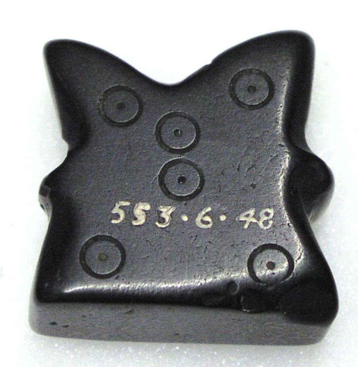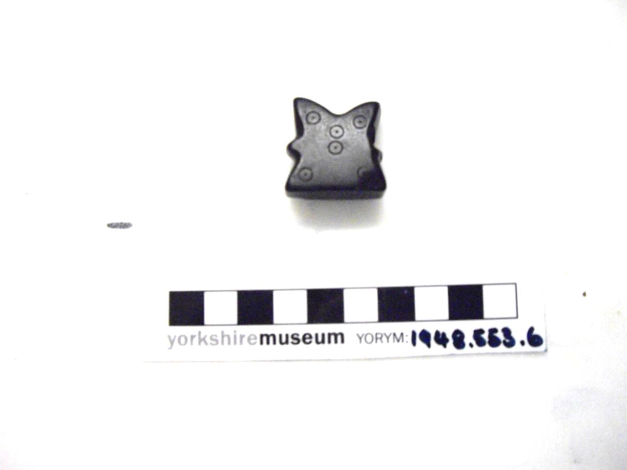 - Jet, possible chess piece - perhaps the rook. Decorated with incised ring and dot.