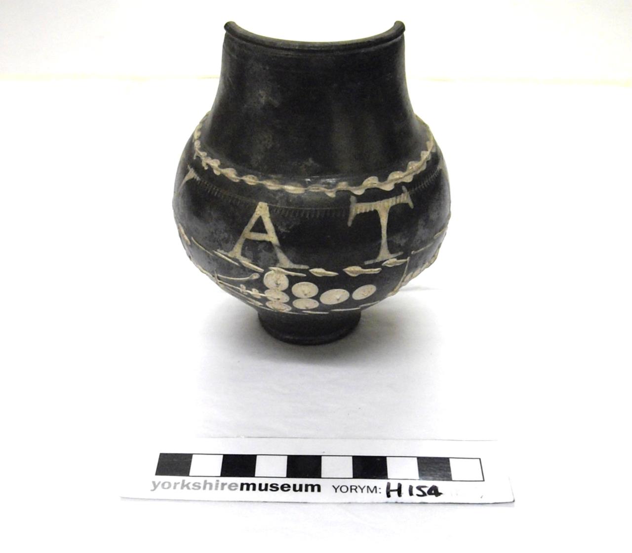 Motto beaker; Form KE (globular pedestal beaker with elongated neck). Decorated with rouletting below the neck and the letters VIVATIS (meaning "Long life to you!") in white slip. Trier Black-Slipped Ware.