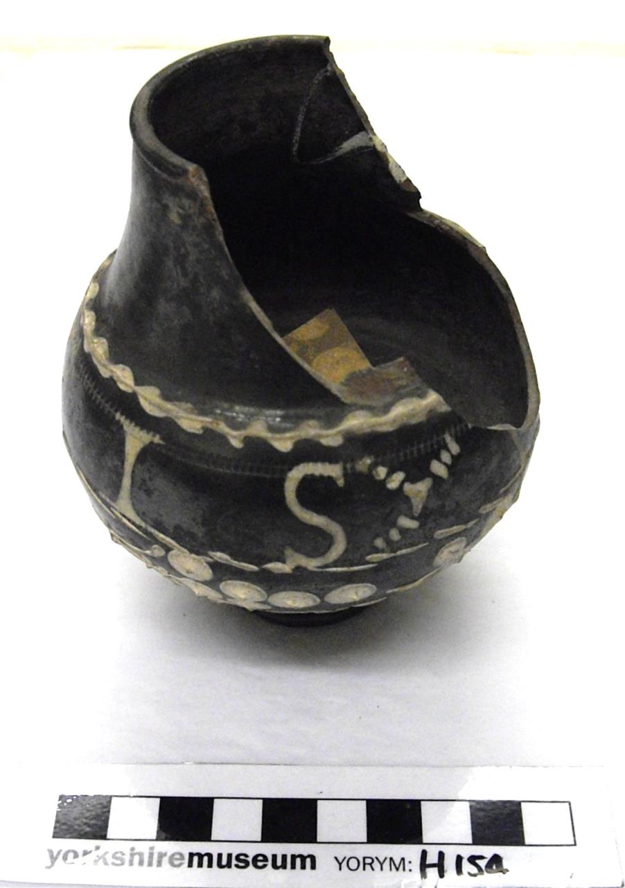 Described in Eboracum as a motto beaker "of dark red fabric with shiny black or metallic colour-coating, inscribed and decorated with white slip". Probably from a grave.