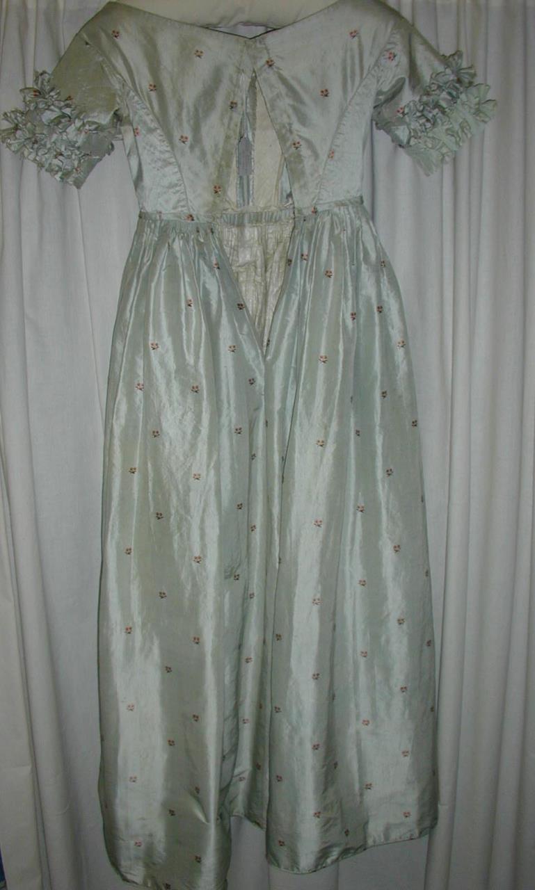 - Evening dress made from pale blue silk, figured with tiny floral sprays in pink.