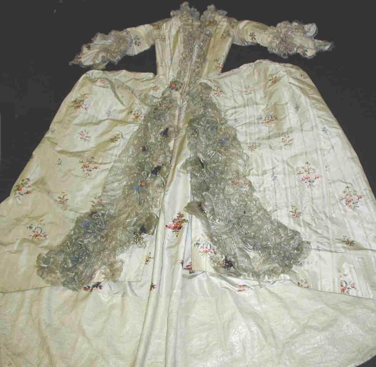 - Silk taffeta robe and petticoat. Woven self stripes and floral motif embroidery.