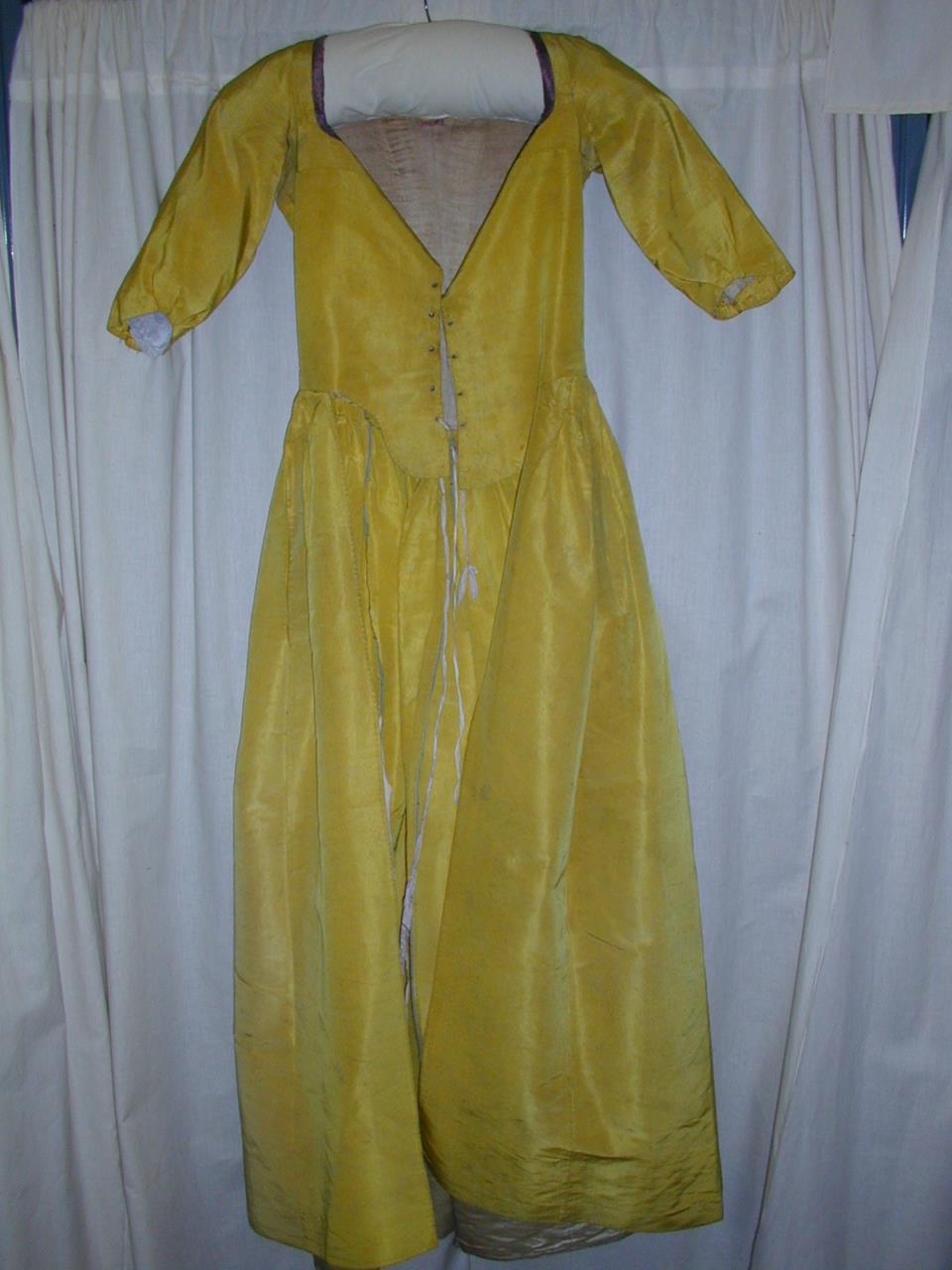 - Dress and petticoat made from sulphur yellow corded silk, dress has a waistcoat bodice with a low square neck trimmed with a silk ribbon.