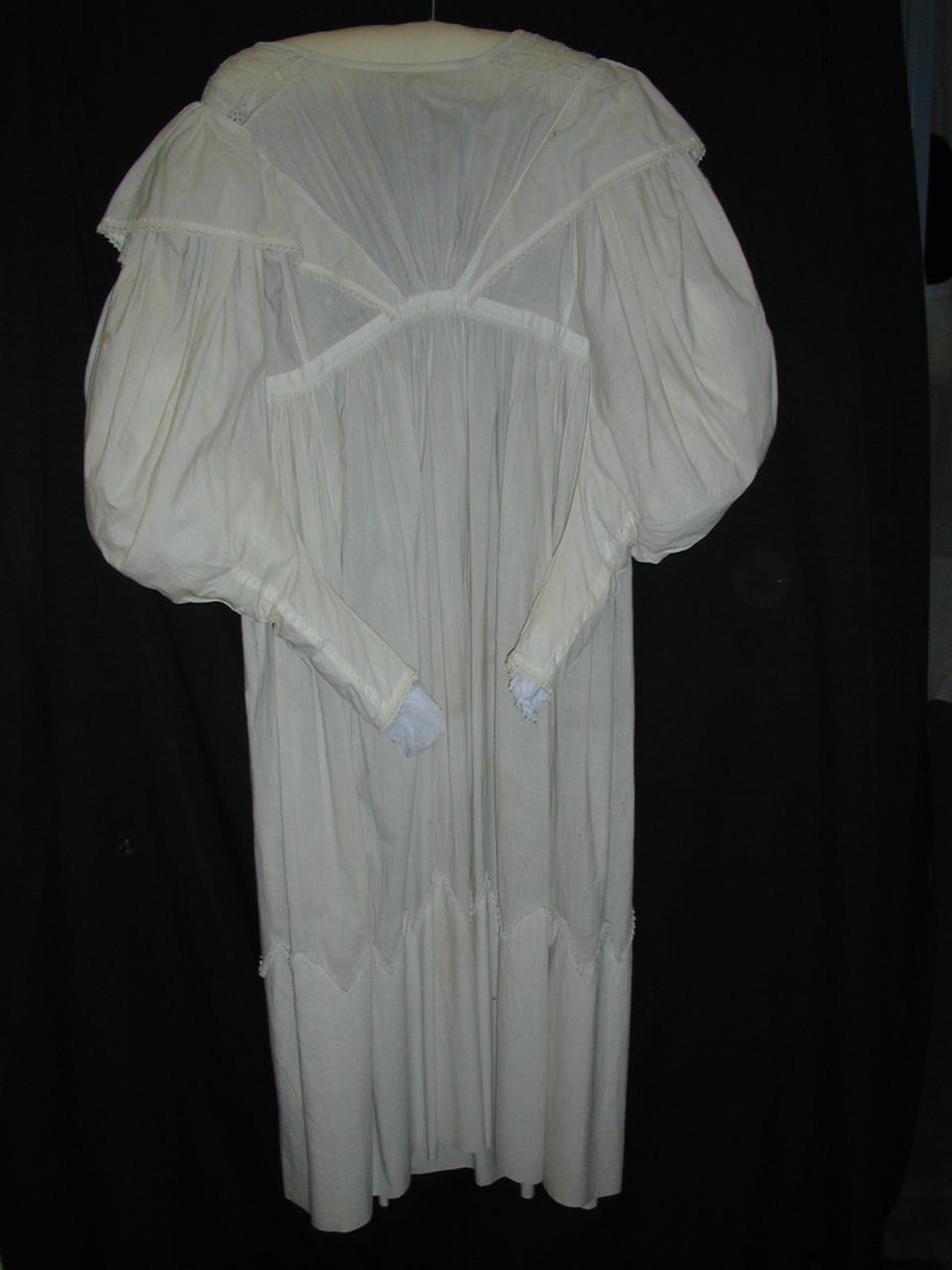 - Day dress made from white cotton, gigot sleeves, which are edged with broderie anglaise.