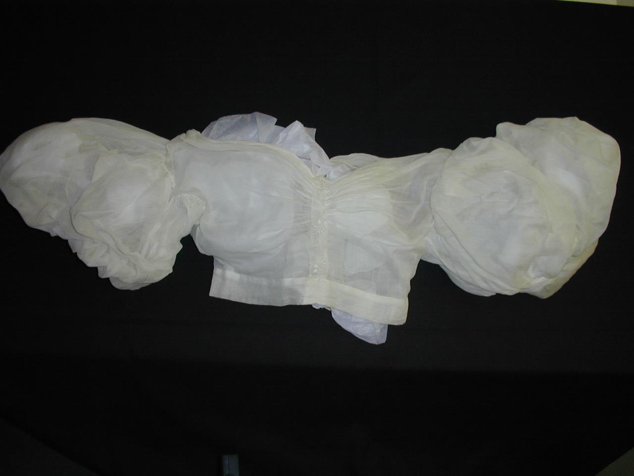 - Front gathered into vertical embroidered band. Semi low neck, unfinished. Gathered on shoulders, back fastens with five linen buttons concealed by embroidery. Back neckline is piped and draped with a muslin fichu. Very full puffed sleeves gathered into piped armhold. Plain cuffs.