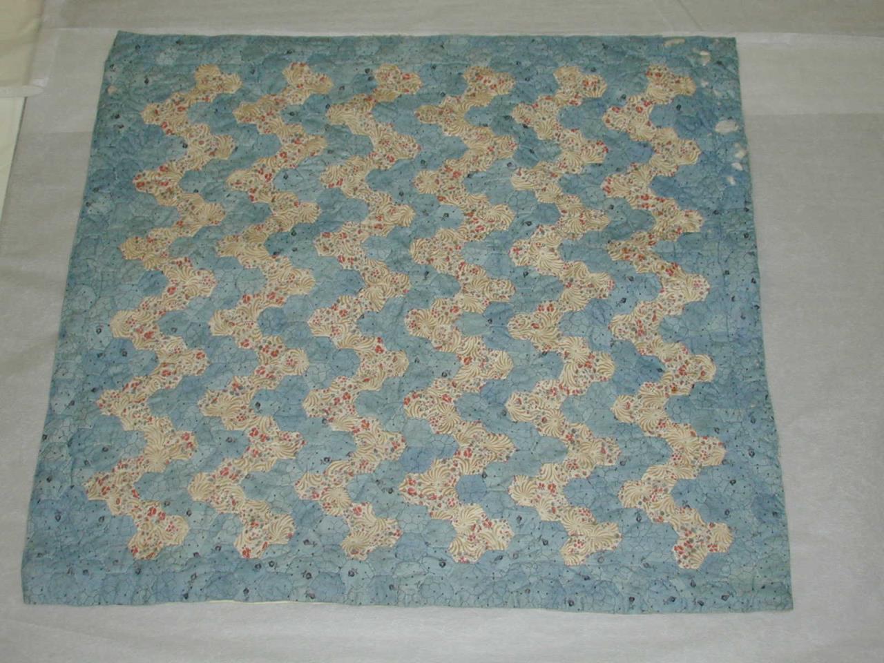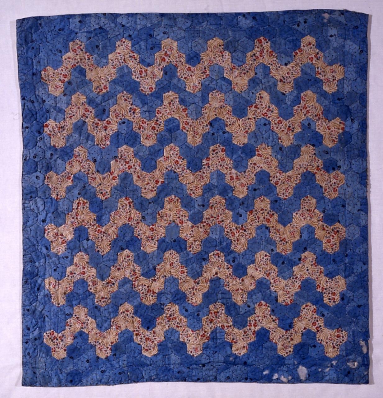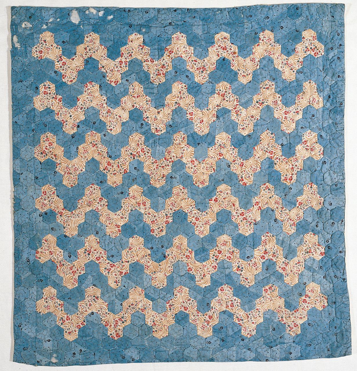 - The cover is made from roller-printed dress cottons, using tiny hexagons to create the Ocean Waves pattern. the cover is interlined with white muslin, and backed with pieced white cotton. Only the edges are quilted, and here the hexagons are outlined in a single line of stitching.
